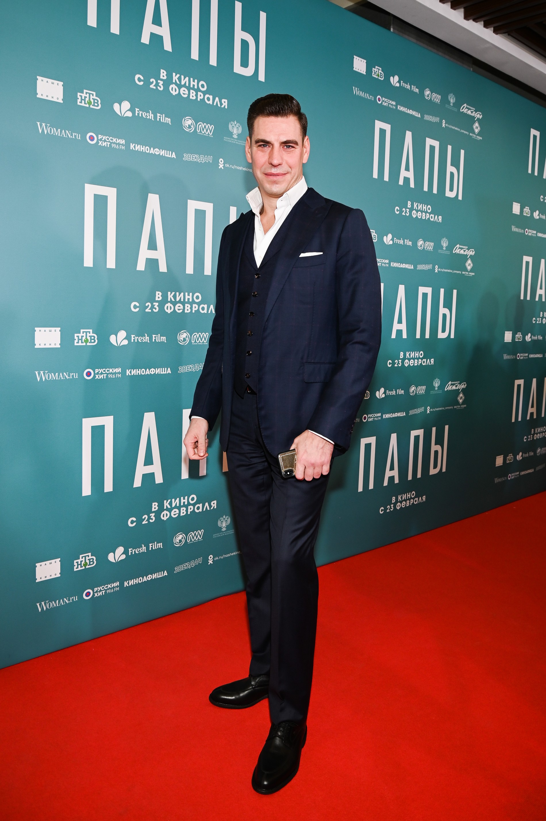Премьера семейной комедии «Папы» о взаимоотношениях отцов и детей прошла в кинотеатре «Октябрь» в Москве. Российский фильм зрителям представили исполнители главных ролей — Юрий Стоянов, Сергей Безруков, Вадим Демчог и другие артисты.