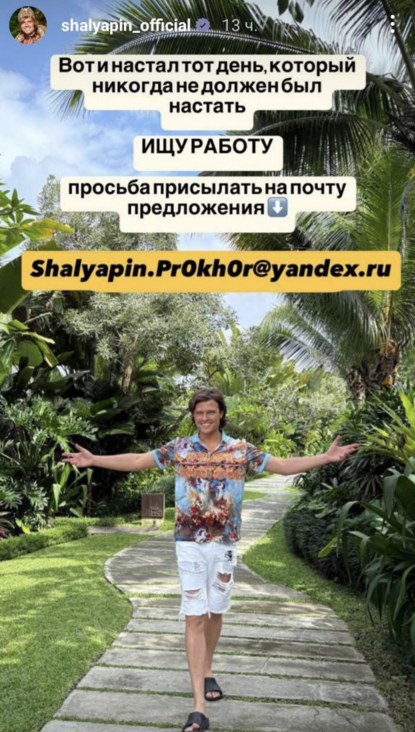 Певец объявил о поиске работы! «Вот и настал тот день, который никогда не должен был настать. Ищу работу! Просьба присылать на почту предложения», — заявил артист в запрещённой соцсети. Волнуемся за Прохора Шаляпина. Что могло случиться, чтобы Прохор Шаляпин решился на такое?! Тревожно.