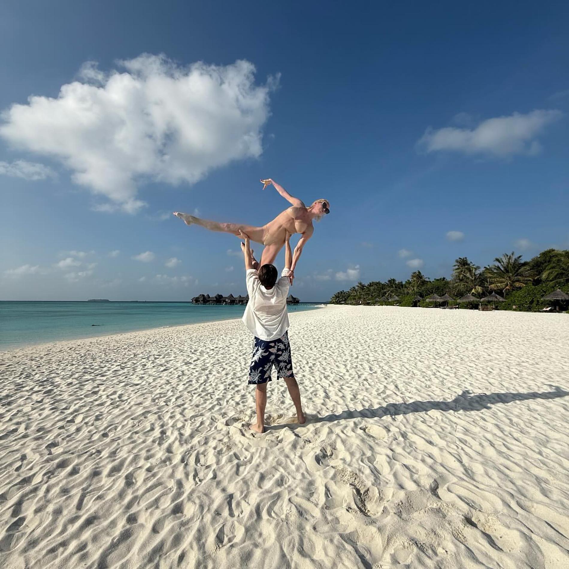 «В руках этого мужчины я всегда и везде чувствую себя надежно и уверенно. Даже на Мальдивах, на прекрасном острове. Решили добавить в него немного творчества. Люблю быть на высоте», — подписала эффектные кадры артистка.