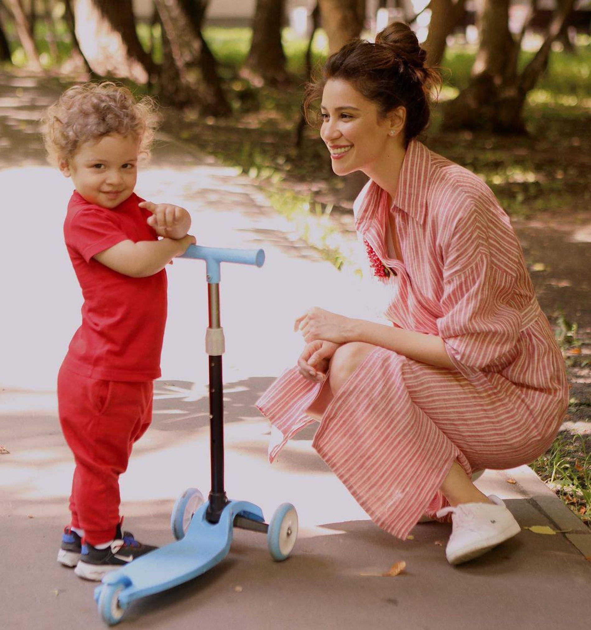 Лето семья, судя по снимкам, проводит в Москве. И Гаспар, как и почти все дети его возраста, сейчас увлечен самокатом.