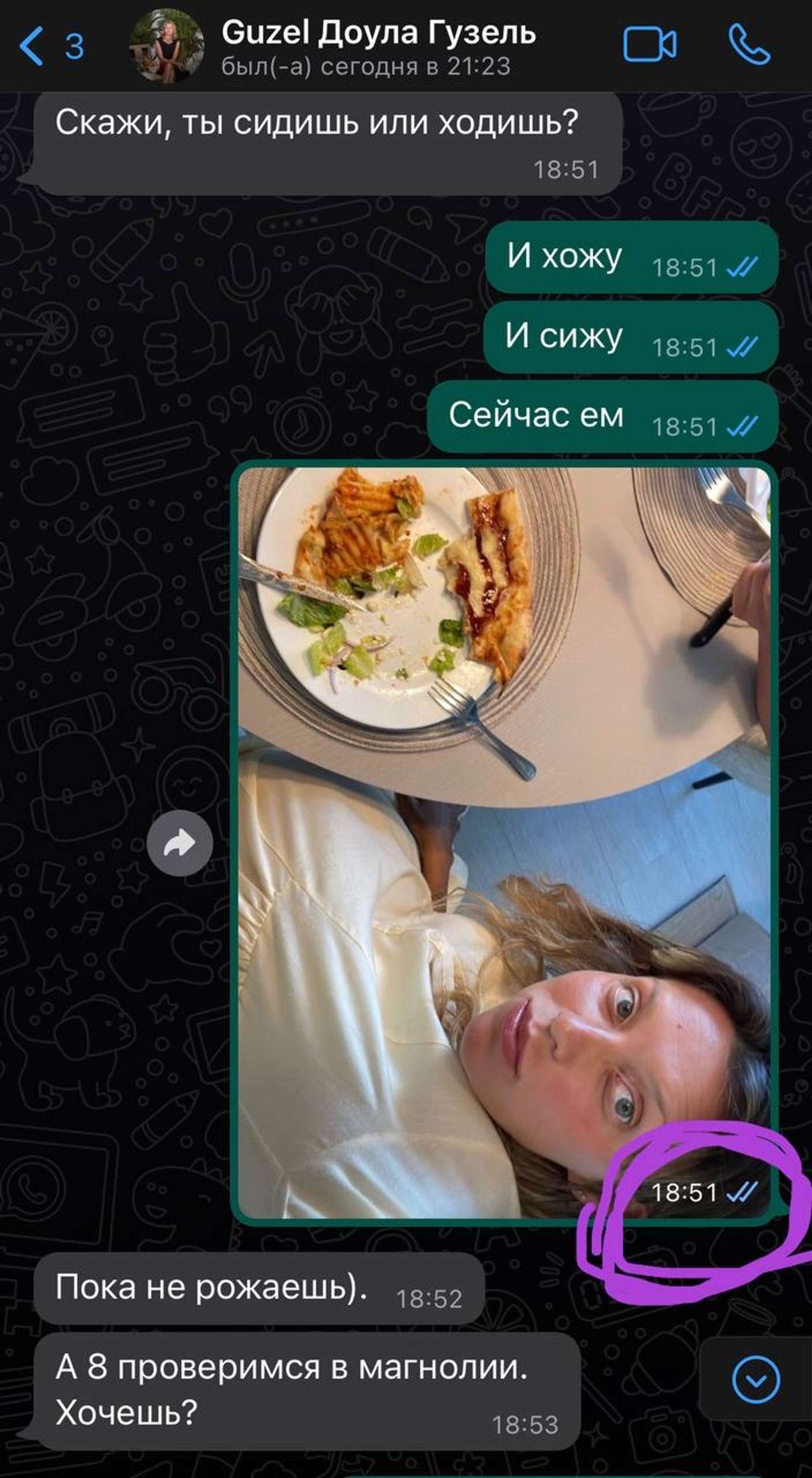 Переписка Регины с Доулой. В 22:30, по ее словам, она уже родила.