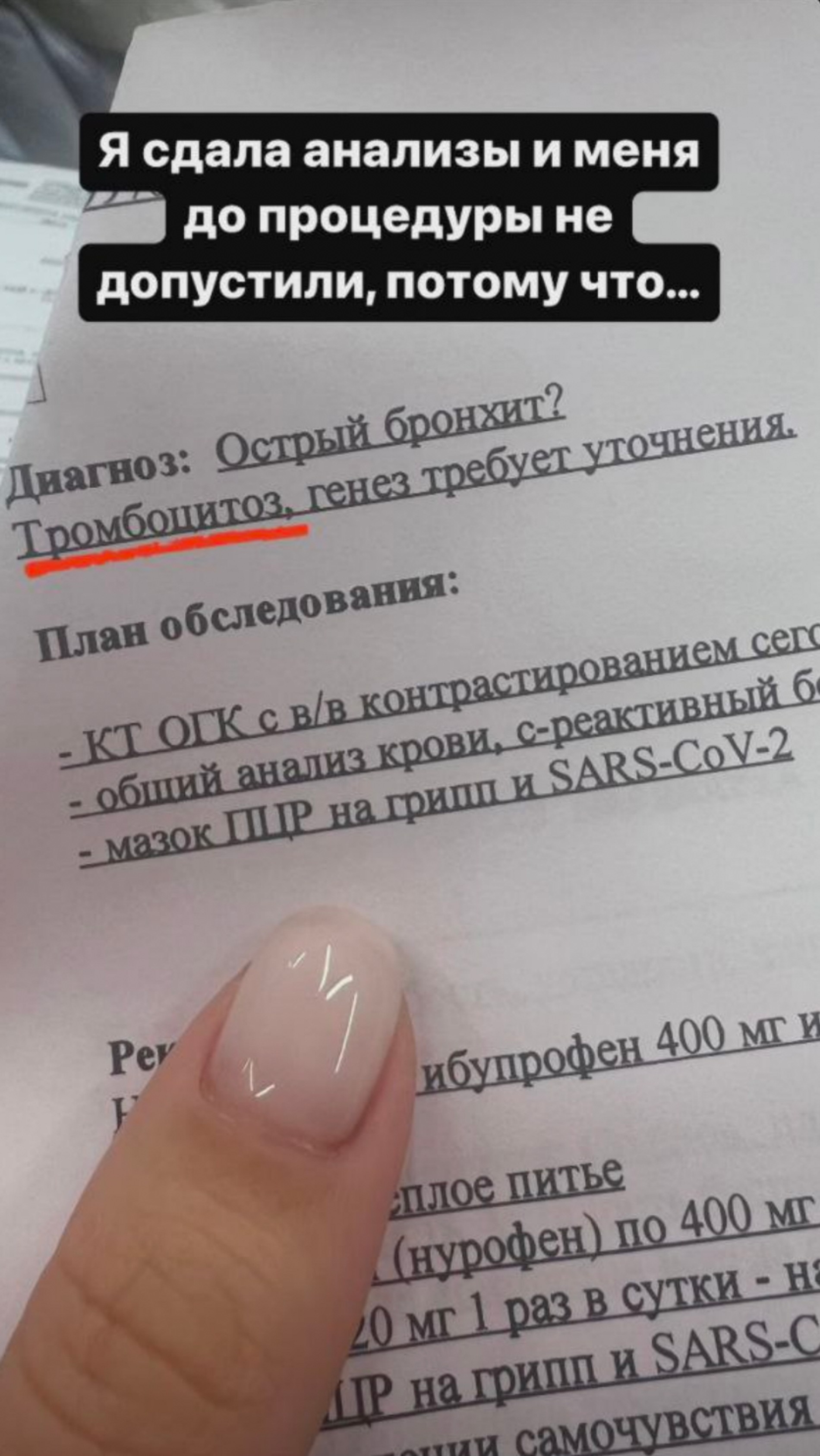 Рита Дакота не раз признавалась, что ее беспокоят грыжи под глазами и что она планирует избавляться от них хирургическим путем. Наконец день Х настал, и певица начала готовиться к операции — проходить обязательное медицинское обследование. Результаты оказались неожиданными: врач поставил Рите диагноз «тромбоцитоз» и сообщил о риске внезапной смерти. Ни о какой операции на лице уже и речи не шло. Вместо этого Риту в срочном порядке направили на КТ с контрастом. «Дерьмовый год может быть еще дерьмовее, если врач полагает, что ты можешь внезапно отъехать от тромбоэмболии», — посетовала Дакота в запрещенной соцсети.