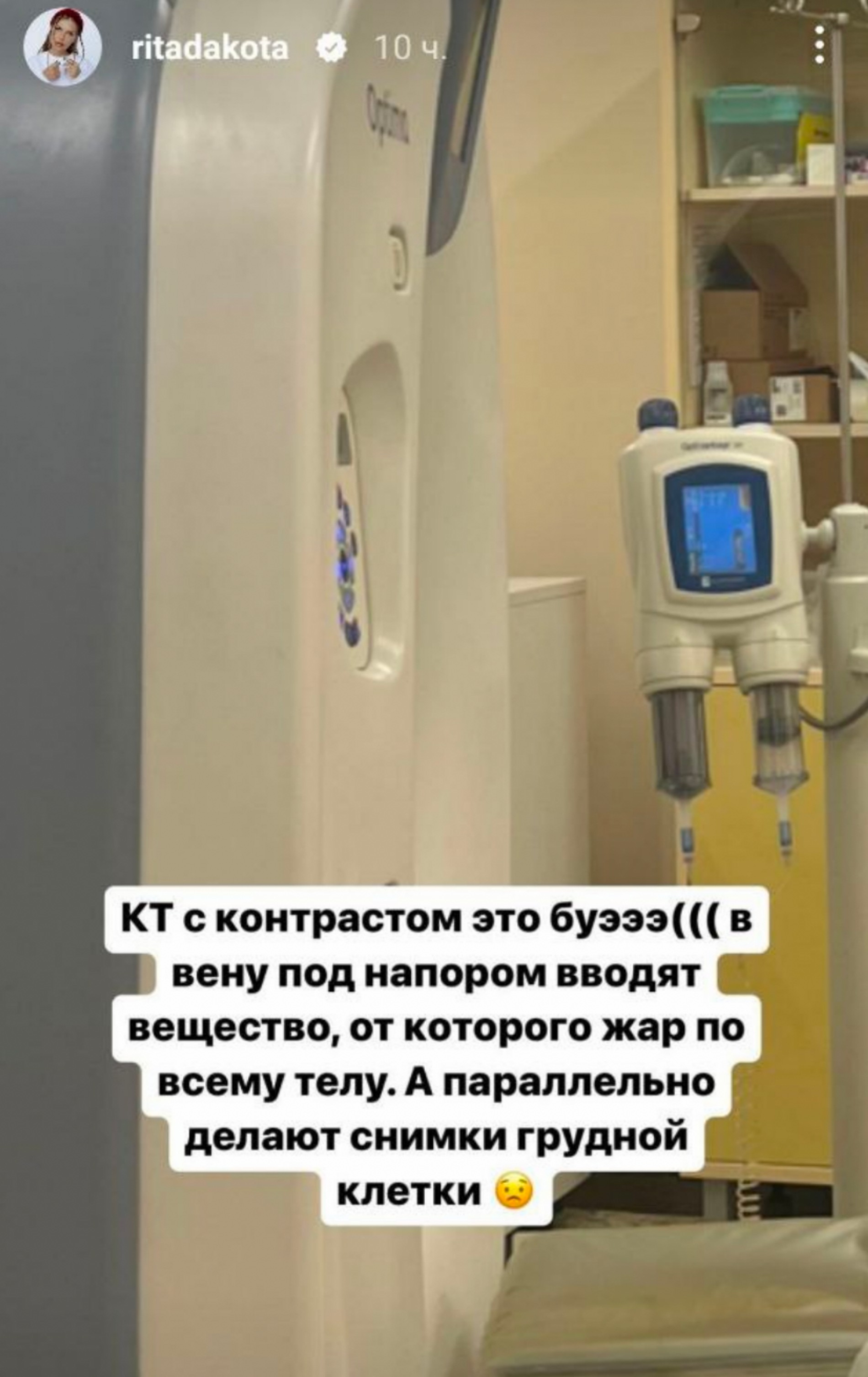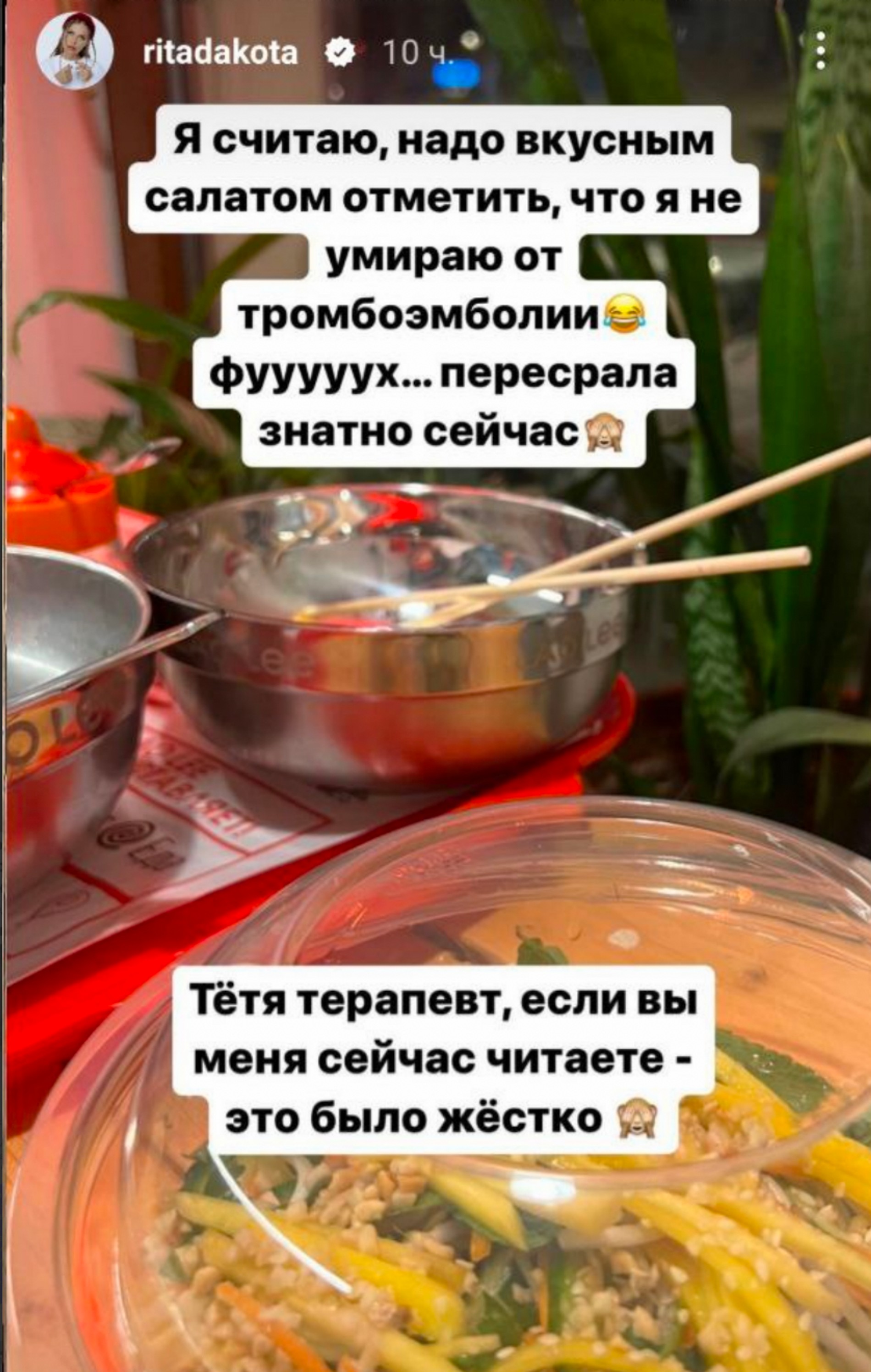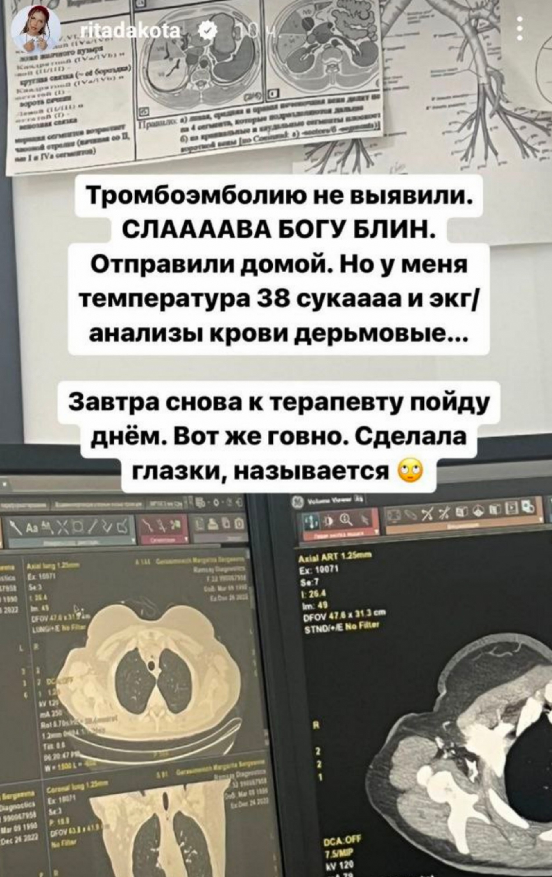 К счастью, процедура не выявила у девушки тромбоэмболию, а значит, и грозящую прямо сейчас смертельную опасность. «Тромбоэмболию не выявили, слава богу. Отправили домой. Но у меня температура 38 и ЭКГ/анализы крови дерьмовые. Завтра снова к терапевту пойду днем. Сделала глазки, называется», — отчиталась Рита. Она призналась, что испугалась действительно сильно. «Я считаю, надо вкусным салатом отметить, что я не умираю. Тетя терапевт, если вы меня сейчас читаете, это было жестко», — призналась певица.