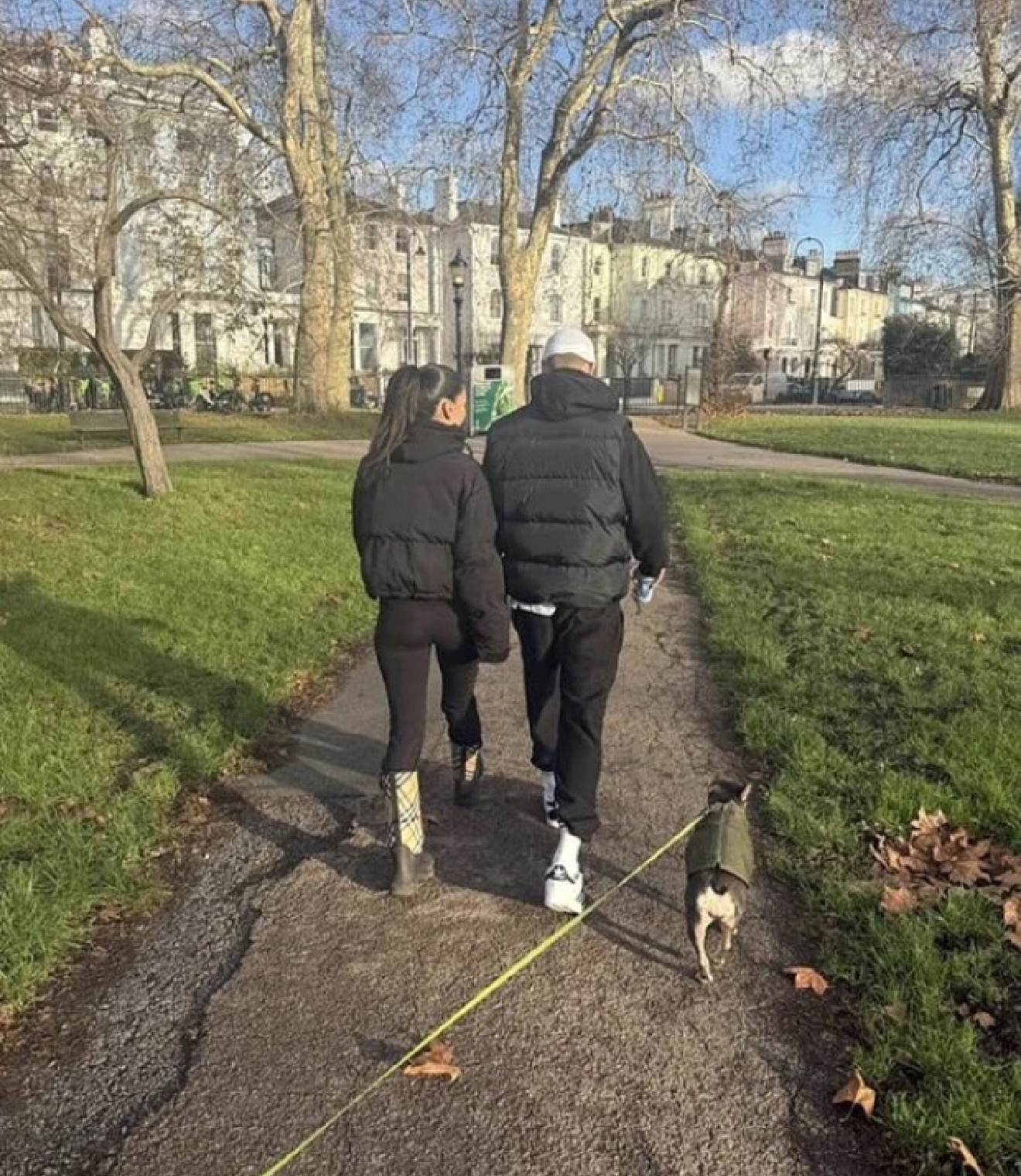 На фотографии пара запечатлена во время воскресной прогулки: молодые люди, одетые в короткие чёрные куртки, шли, держась за руки. Компанию им составил пёс, которого выгуливал человек, сделавший снимок. К публикации наследник Бекхэмов добавил эмодзи с сердечком.