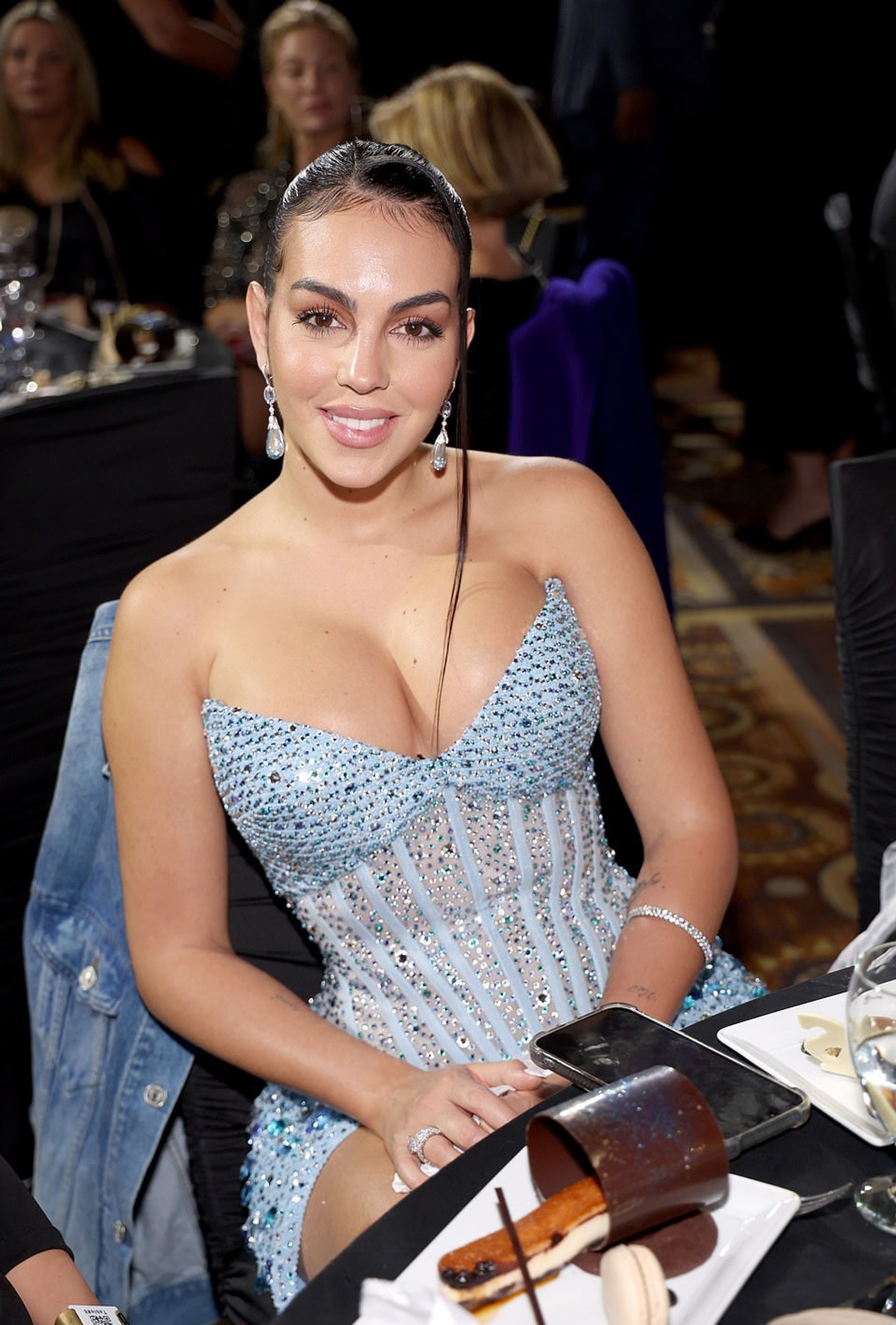 Звезда реалити-шоу «I am Georgina» явно не боялась привлечь к себе лишнее внимание: сверкающее корсетное платье небесно-голубого цвета она дополнила серьгами-каплями, браслетом и кольцами, усыпанными бриллиантами. Впрочем, кого мы хотим обмануть: все взгляды были прикованы к ее впечатляющему декольте.