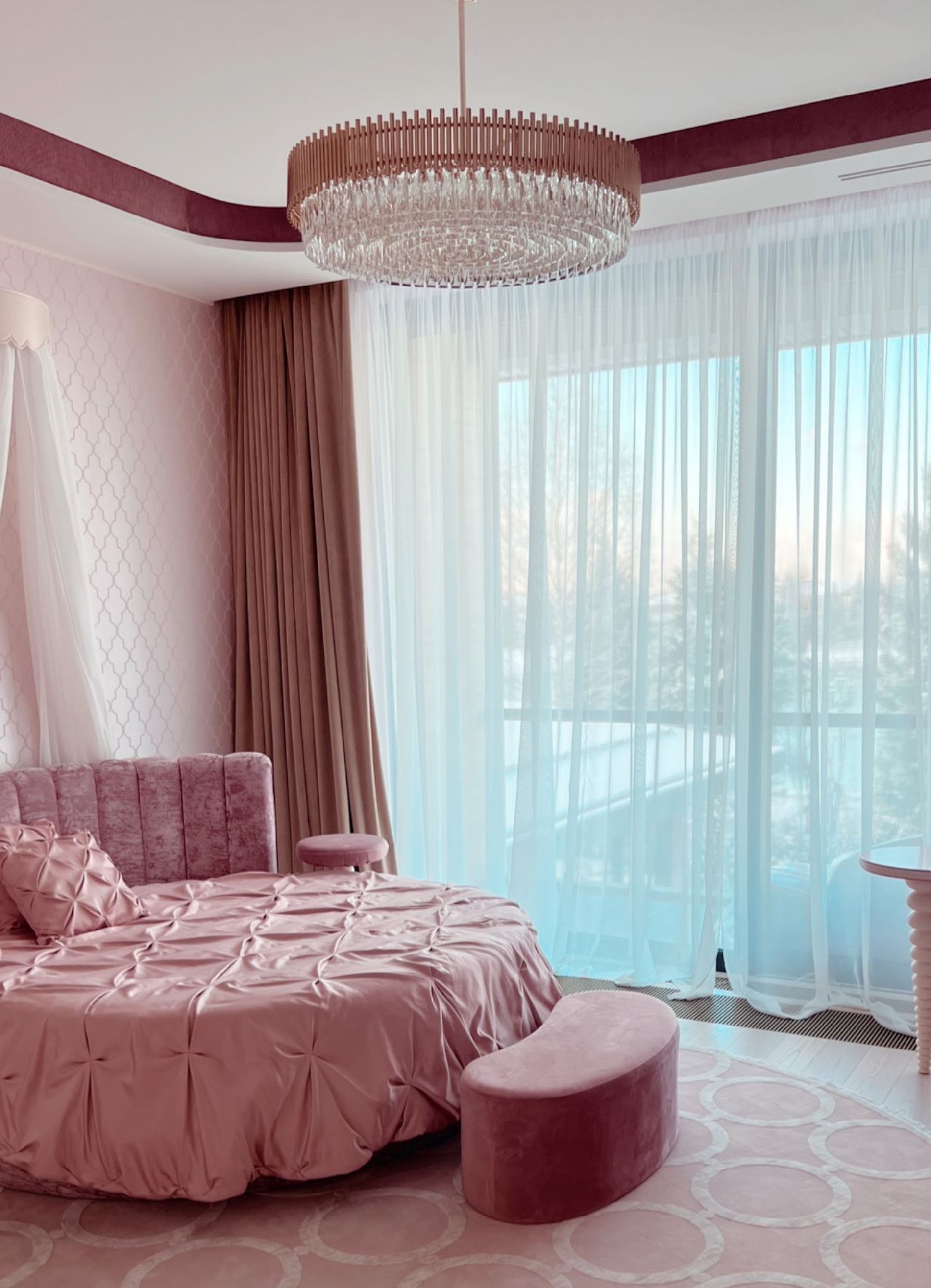 Импровизированный рум-тур она начала прямо в спальне. Первое, что бросается в глаза, — два огромных окна во всю стену: сквозь светлые шторы видно заснеженные деревья. В интерьере — никакого леопарда и красного бархата, комната выдержана в нежных светлых тонах. Впрочем, не все так целомудренно: зеркальный потолок над кроватью намекает на нескучные ночи.