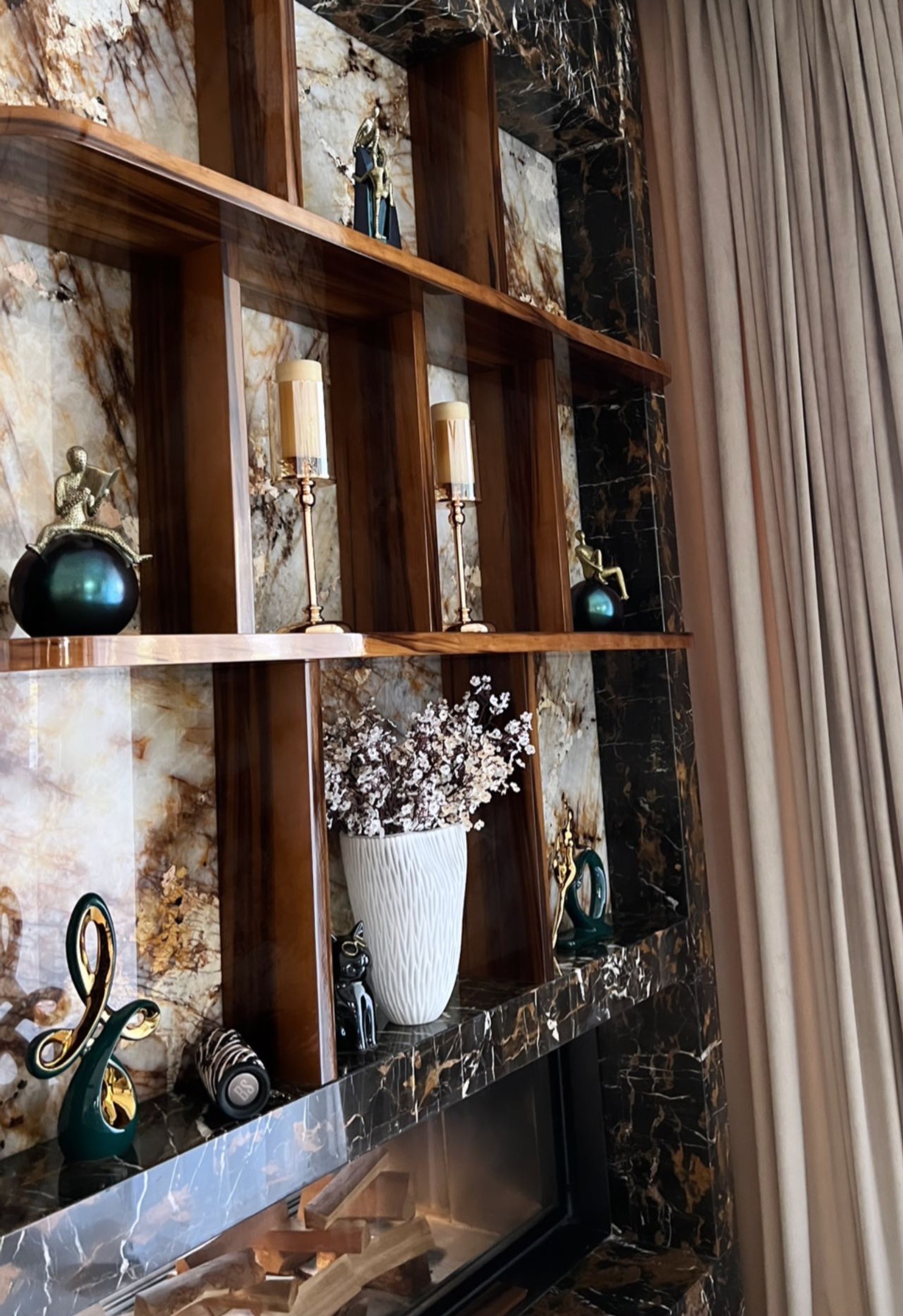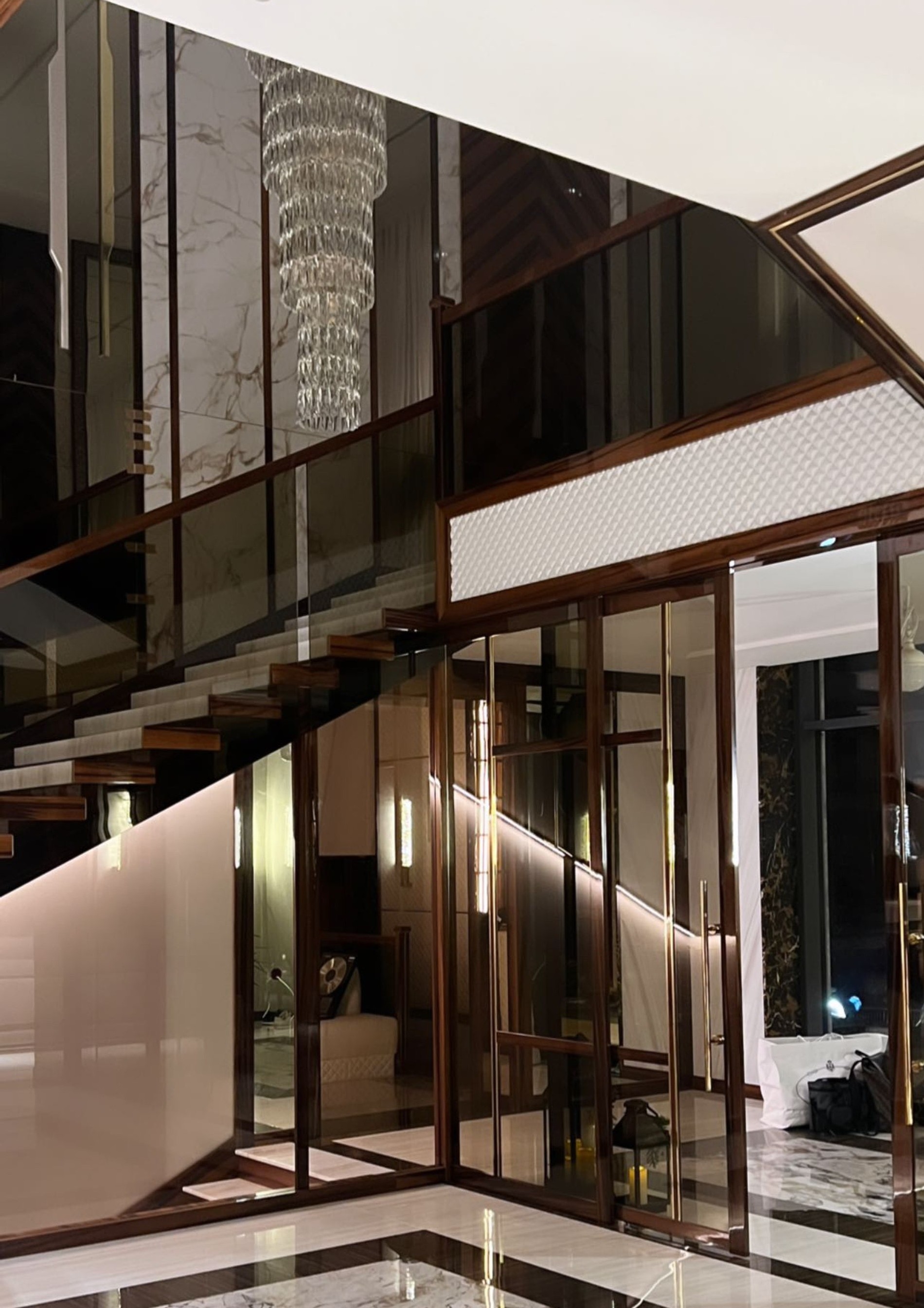 На первом этаже –— просторный холл, который легко спутать с лобби хорошего отеля: мрамор, дерево, стекло и огромная люстра — куда же без нее. На заднем плане можно заметить награду в виде диска: таких в этом доме будет немало.