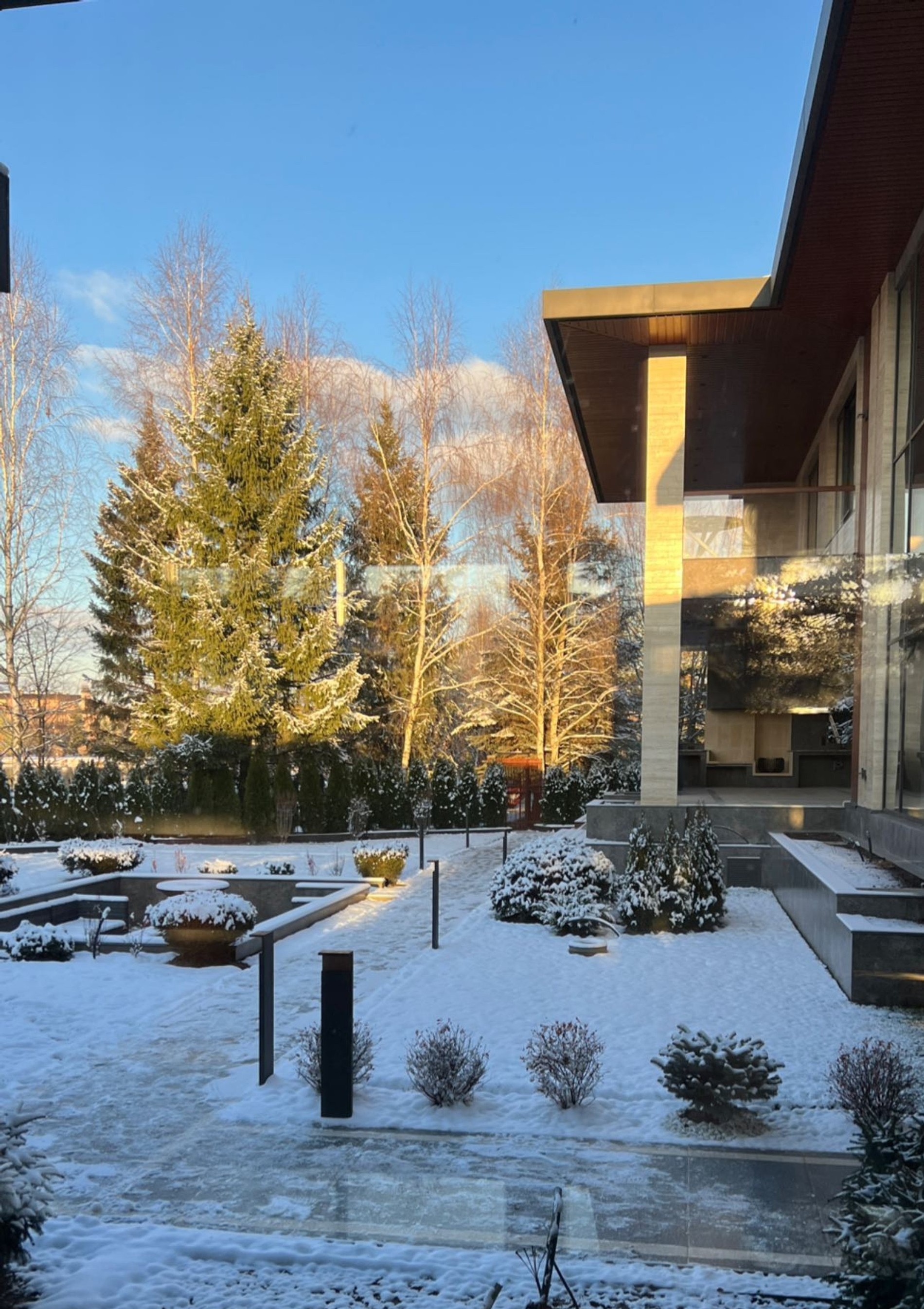 Участок дому под стать: внушительных размеров территория и фонтан аккурат перед входом. Грядок и теплиц мы здесь, конечно, не увидим, а вот декоративные растения, как мы уже поняли, Ханне с Пашу не чужды. Озеленить двор успели до морозов.