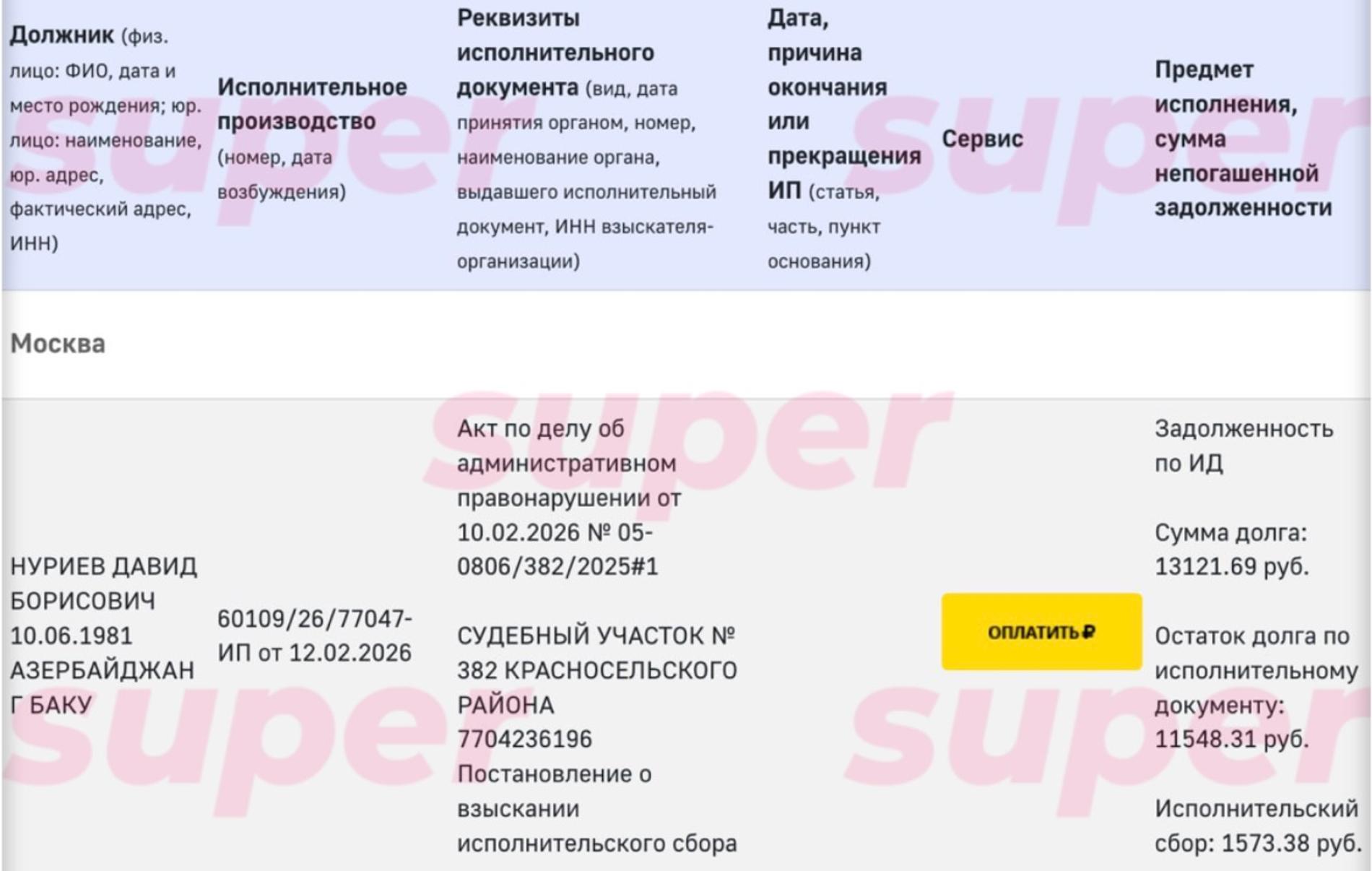 Сейчас в отношении артиста действуют два исполнительных производства. Первое касается неоплаченного штрафа за повторный проезд на красный свет: изначально суд назначил сумму в 15 тысяч рублей, но с учётом исполнительского сбора она возросла до 16,5 тысяч рублей. При этом часть задолженности уже погашена.