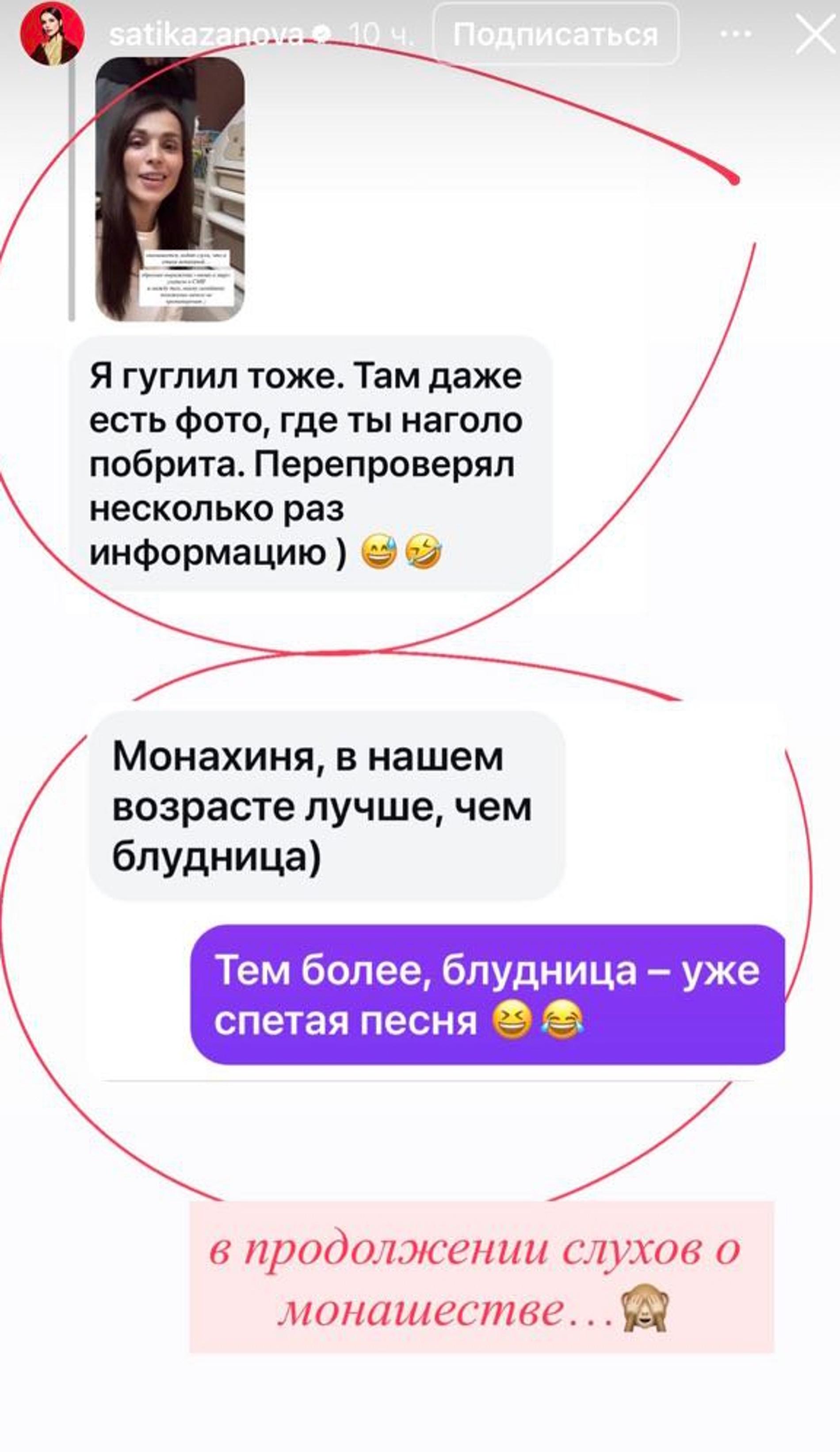 Сати Казанова с иронией отреагировала на слухи о своём монашестве: в соцсетях экс‑участница «Фабрики» уточнила в запрещённых соцсетях, что её выражение «монах в миру» поняли буквально. Однако в монастырь она не ушла — недавно вернулась с супругом с одного светского мероприятия, где они со смехом прояснили ситуацию.
