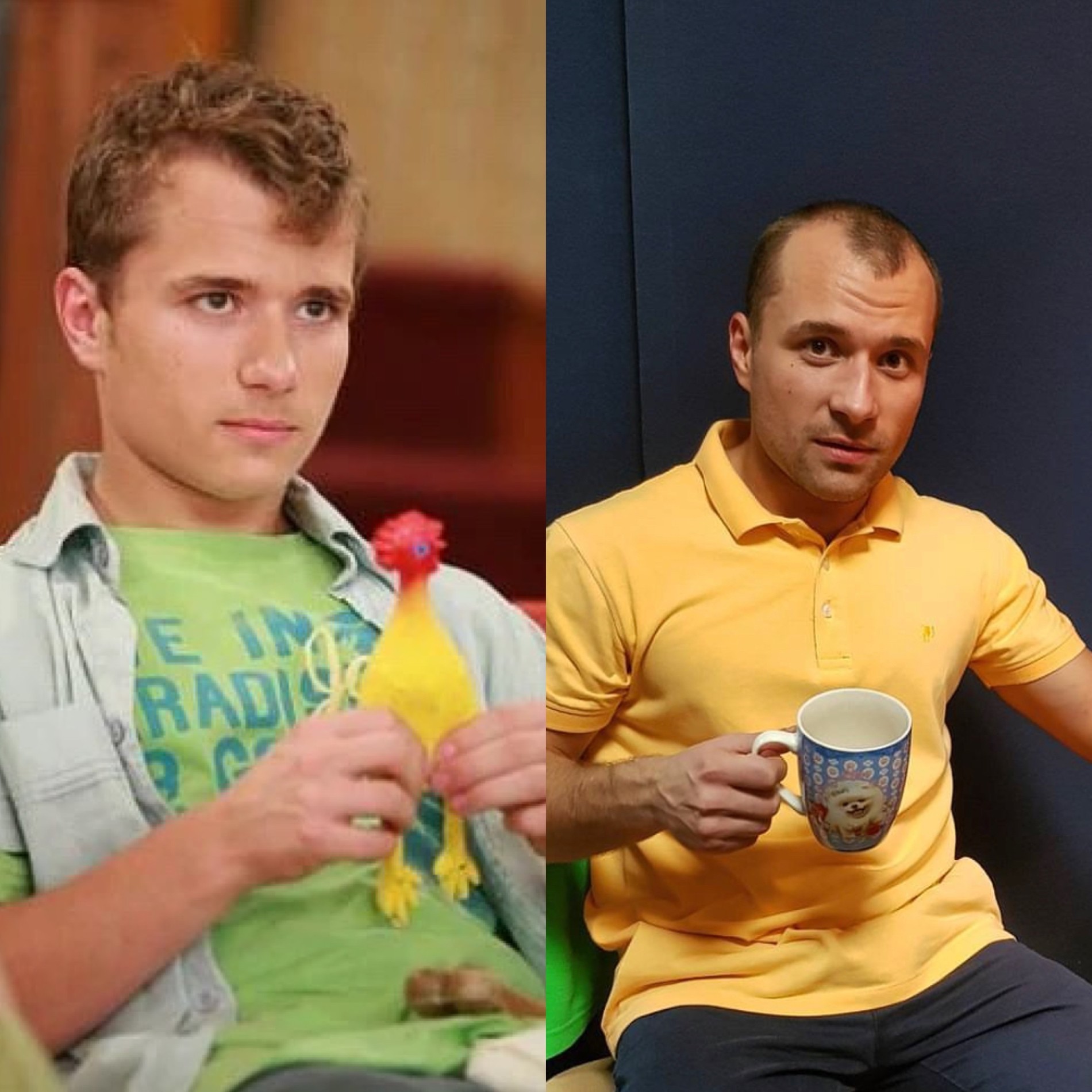Если Ромке Букину с девушками не везло, то у 32-летнего Александра Якина с этим все превосходно. Уже шесть лет он живет в браке с актрисой Анной Зайцевой. В карьере у него тоже все путем: актер ежедневно играет в спектаклях и даже вел передачу «Идем в кино!» на телеканале «Карусель». Многие его знают и любят не только по «Счастливы вместе», но и благодаря сериалу «Восьмидесятые». А так Грандмастер Бит почти не изменился, только кудри состриг.