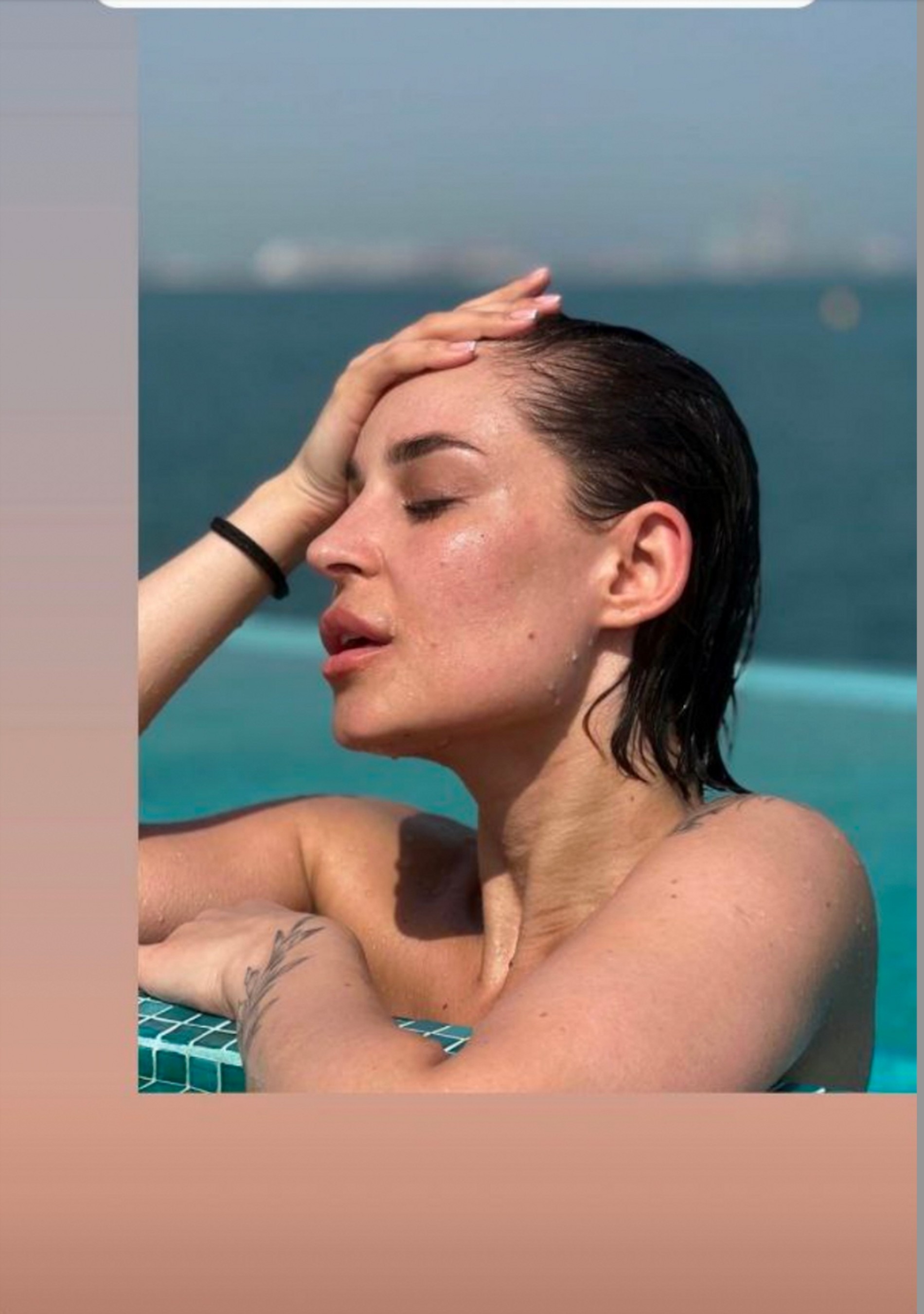 На нем Севиль запечатлена в бассейне, вероятно, во время отдыха в жарких странах. Мы видим, как по ее лицу стекают капли воды и, в общем-то, верим, что макияжа на певице нет. Что же, отметим отличное состояние кожи: налицо (вернее, на лице) гладкость, упругость и вполне ровный и здоровый тон. Севиль, как насчет того, чтобы и на сцену так выходить? Столько времени на майке сэкономить можно! И мицеллярка целее.