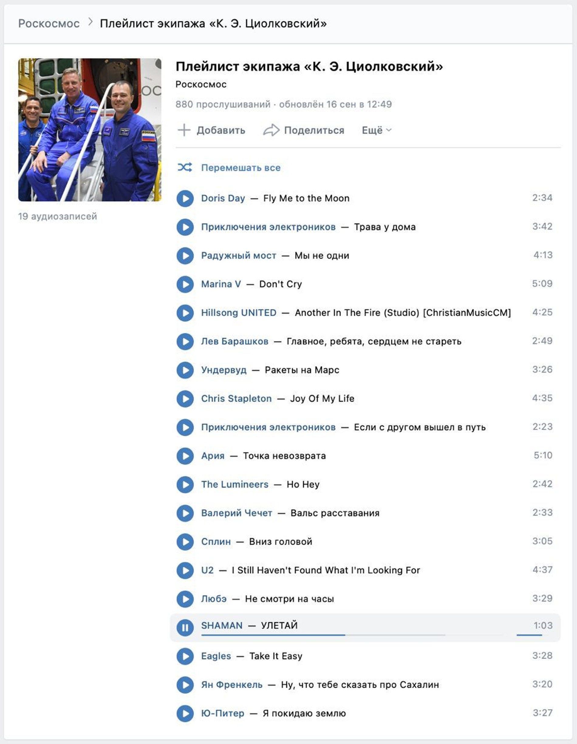 Голос российского исполнителя Ярослава Дронова, он же Shaman, теперь будет звучать за пределами нашей планеты. Его песню «Улетай» включили в официальный плей-лист очередной экспедиции «Роскосмоса». Список всех музыкальных композиций можно посмотреть ВКонтакте, всего их 19.