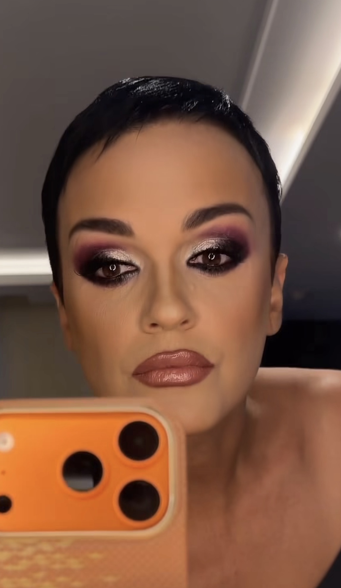Слава появилась в кадре с ярким вечерним макияжем, который эффектно подчеркнул и глаза, и губы. Певица разглядывала себя в зеркале и явно любовалась отражением.