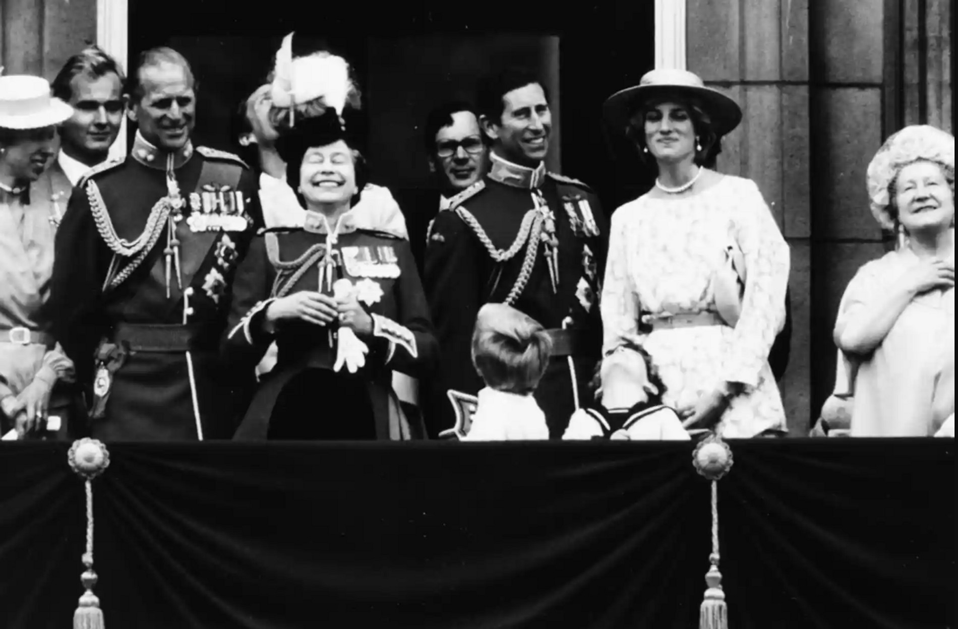 1983: королева заливается смехом со своими внуками Уильямом и Гарри на балконе Букингемского дворца. Ее муж, сын и невестка тоже веселятся — но с чуть меньшим энтузиазмом.