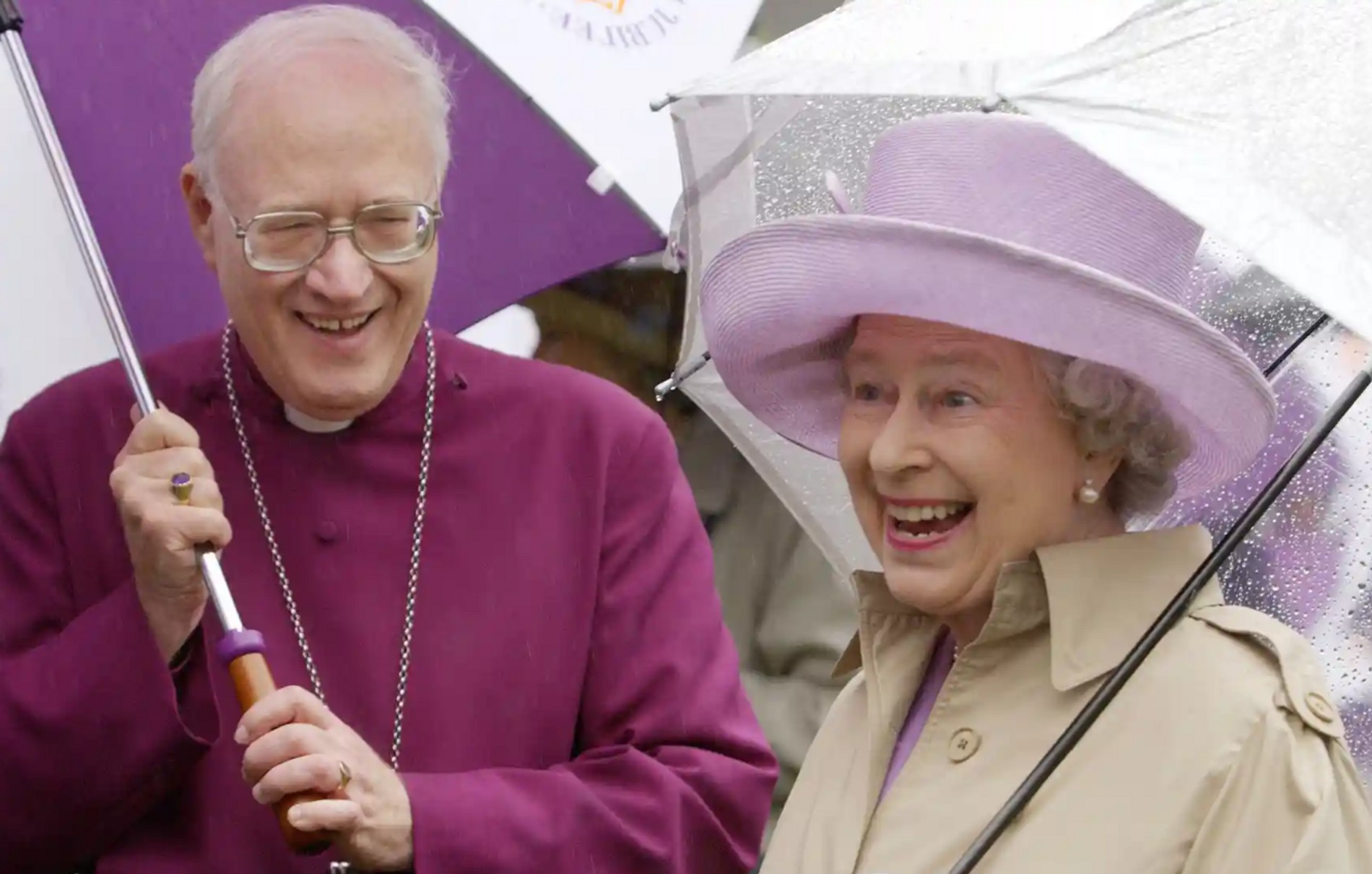 2002: Елизавета II радуется дождю с архиепископом Кентерберийским доктором Джорджем Кэри на королевской вечеринке в саду Ламбетского дворца в Лондоне.