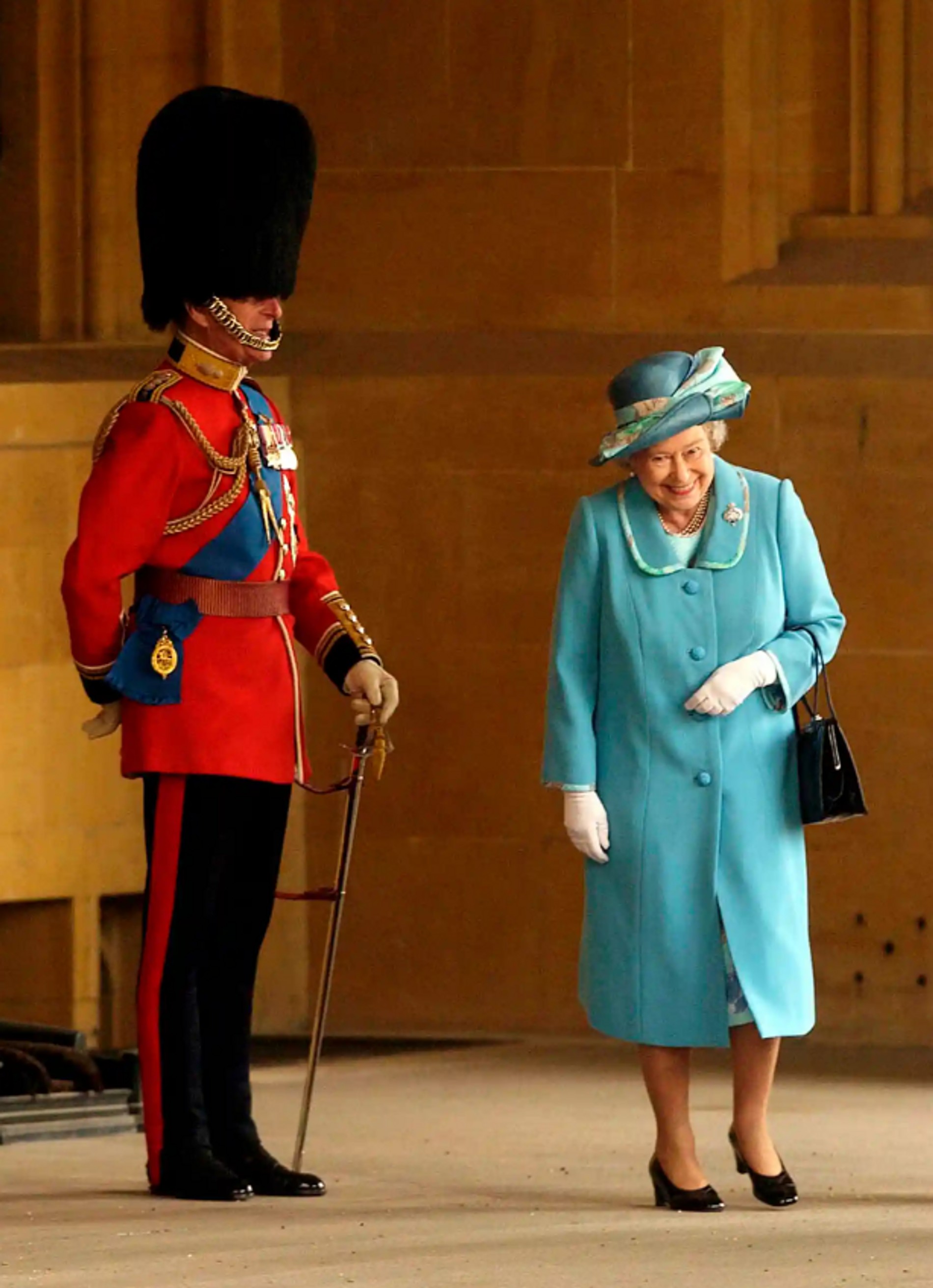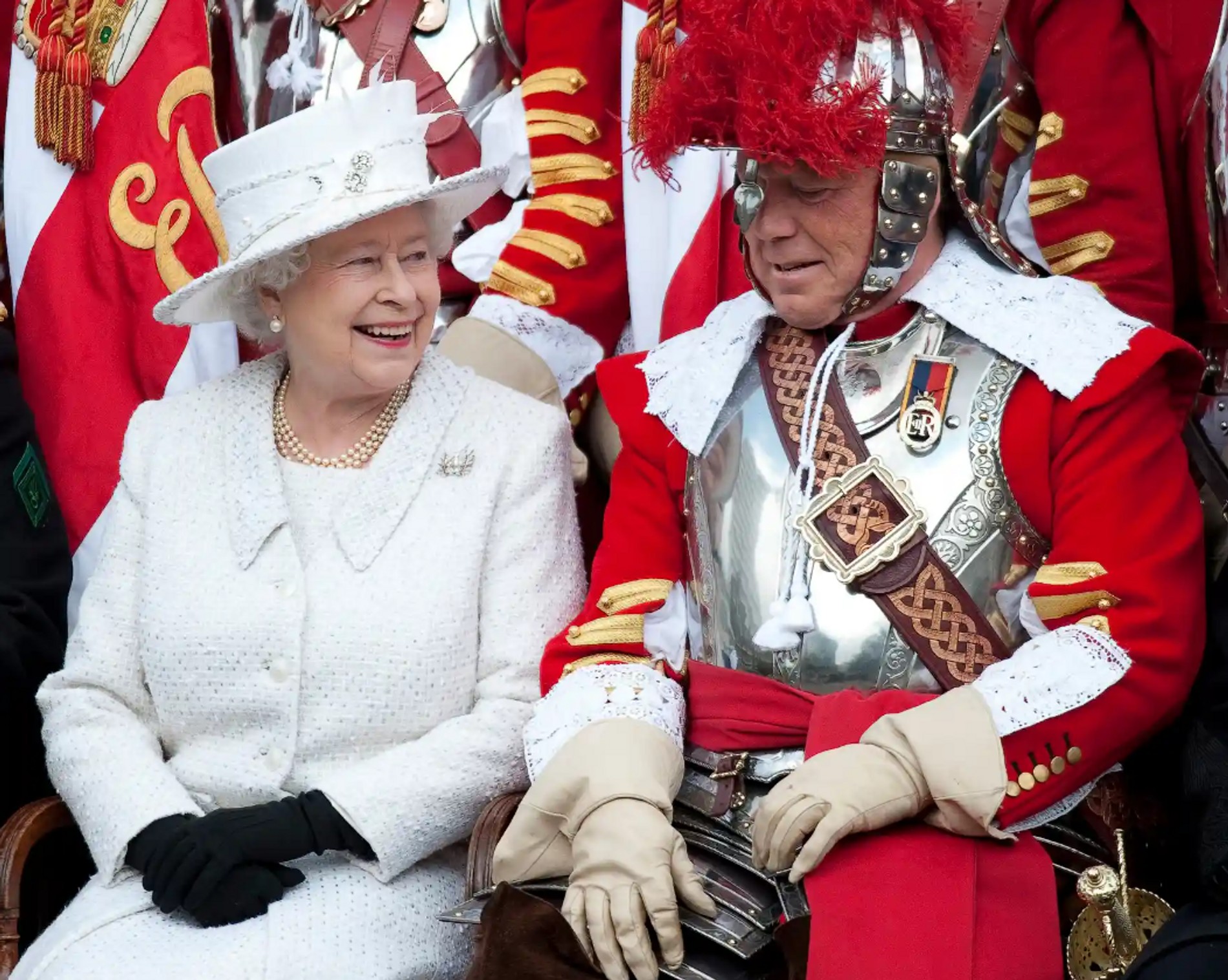 2010: Елизавета II с юмором реагирует на неловкую ситуацию: позируя с Почетной артиллерийской ротой для фотографии, она запуталась в доспехах майора Пола Чэмпнесса, капитана копейщиков и мушкетеров.