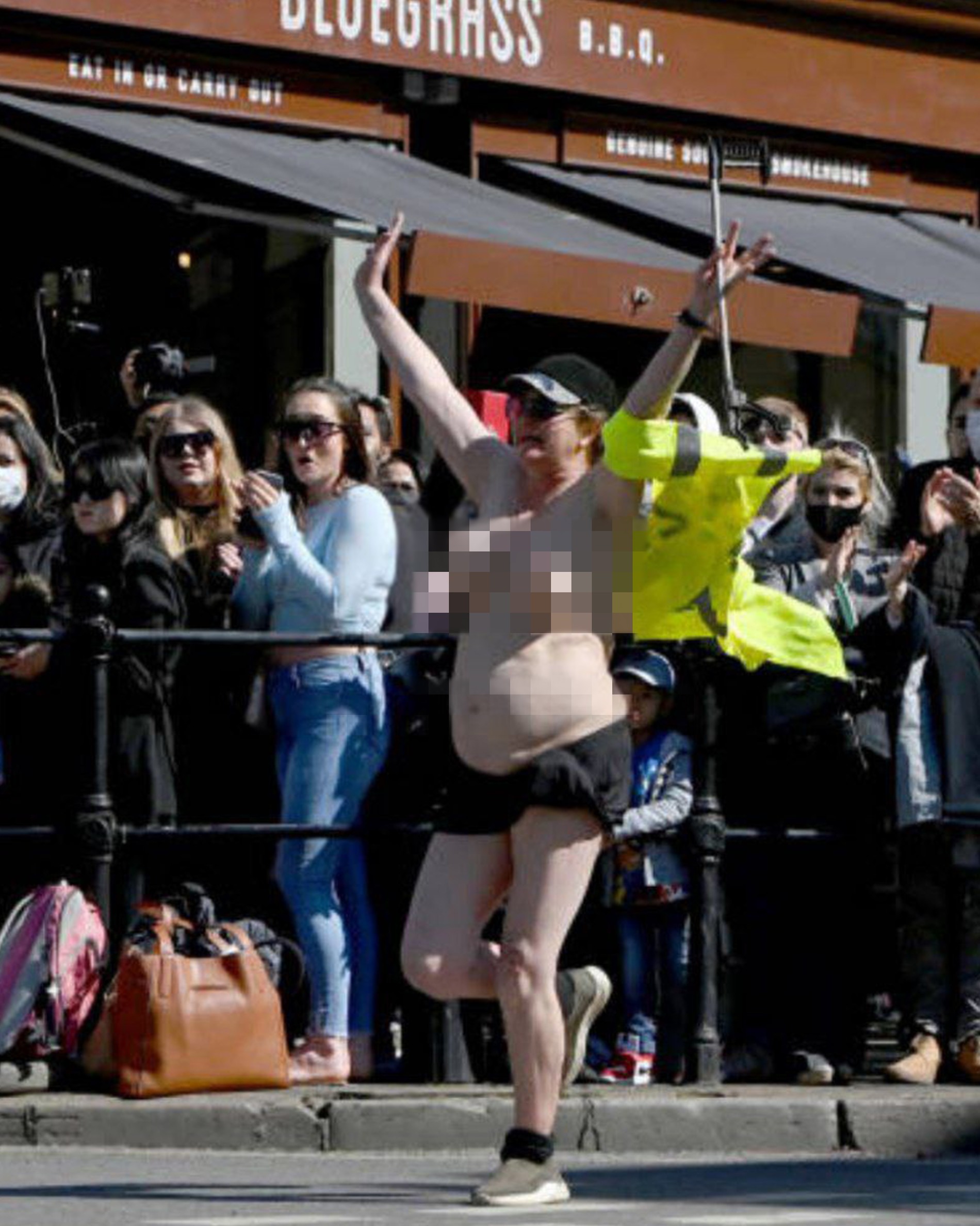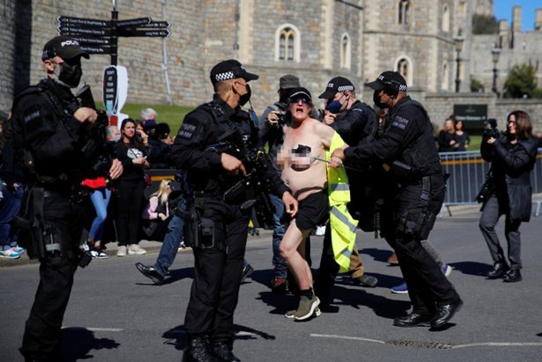 Женщина с обнаженной грудью пыталась прорваться к Виндзору во время похорон принца Филиппа. Дама в годах, кепке и очках (как по классику) успела совершить эффектную пробежку у самых стен замка, запрыгнуть на статую королевы Виктории и выкрикнуть «спасите планету». После этого ее скрутили местные полицейские и проводили в автозак.