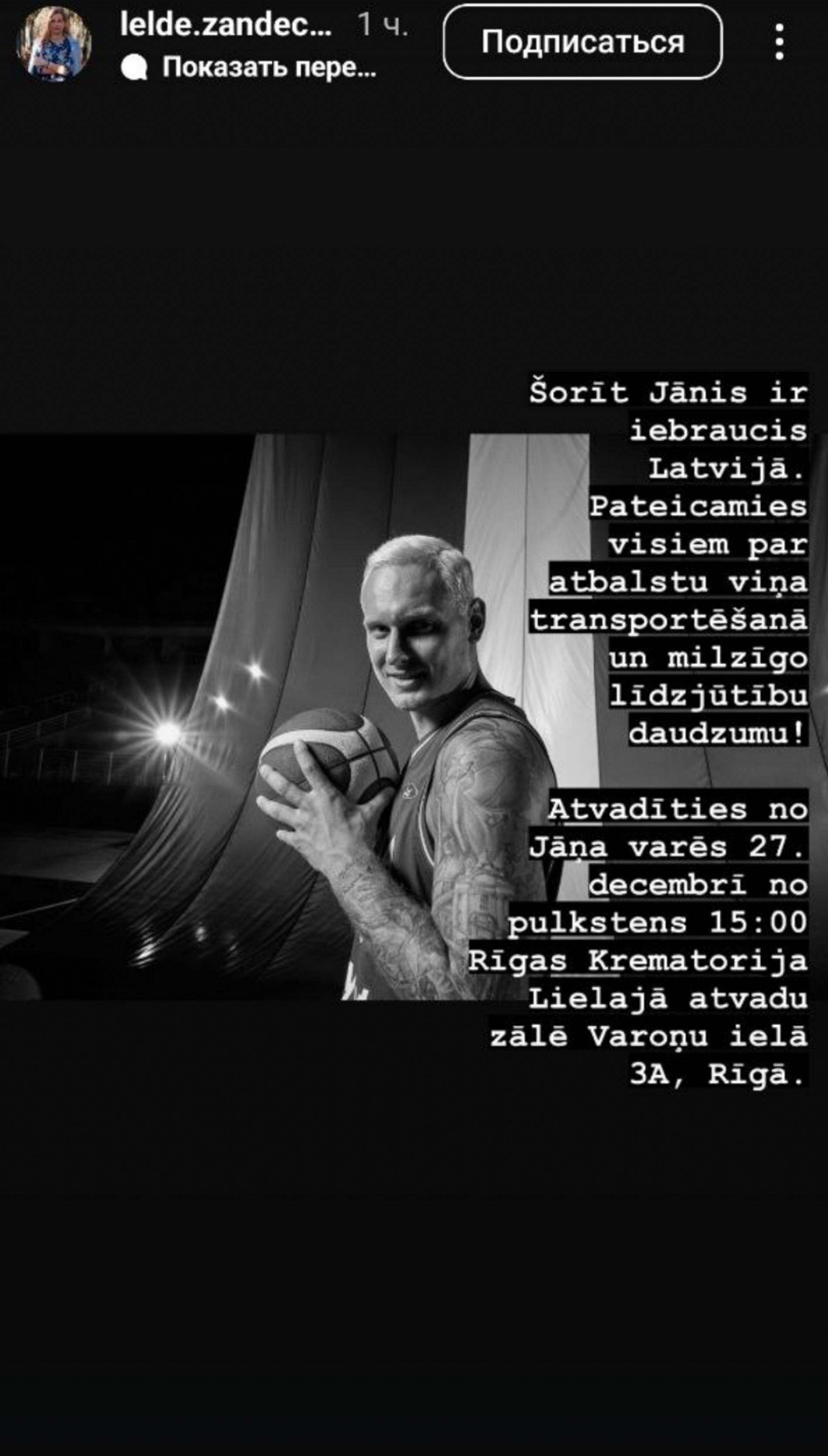 «Янис приехал в Латвию. Благодарим всех за помощь в транспортировке его тела, в том числе огромное количество фанатов. Попрощаться с Янисом можно будет 27 декабря с 15:00 в Большом зале прощания Рижского крематория»