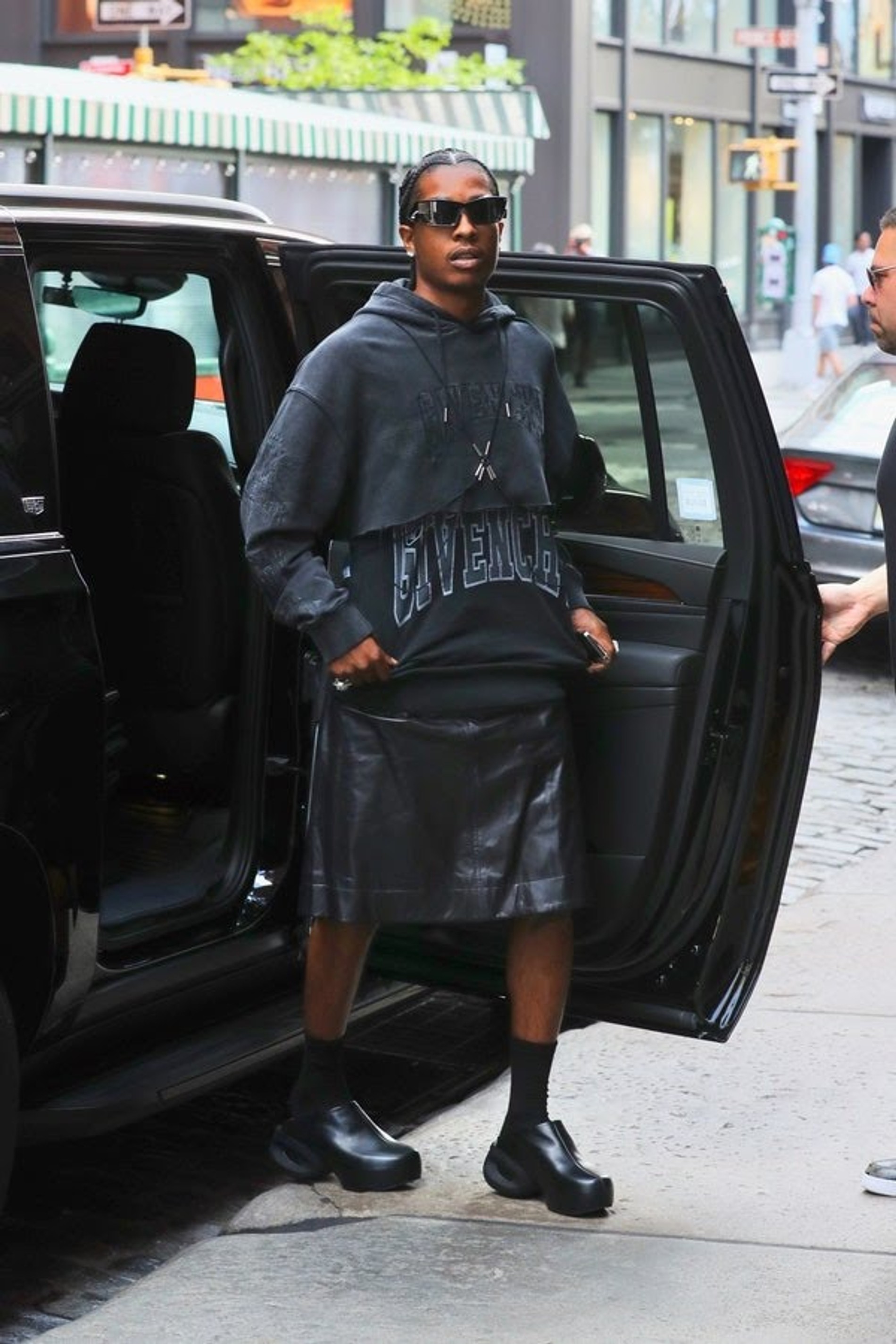 A$AP Rocky вышел на прогулку по Нью-Йорку с ног до головы в Givenchy. Рэпер давно и исправно носит юбки, удивляться тут нечему. А вот выбору материала — пожалуй. Кожаная юбка в августовскую жару точно не для каждого!
