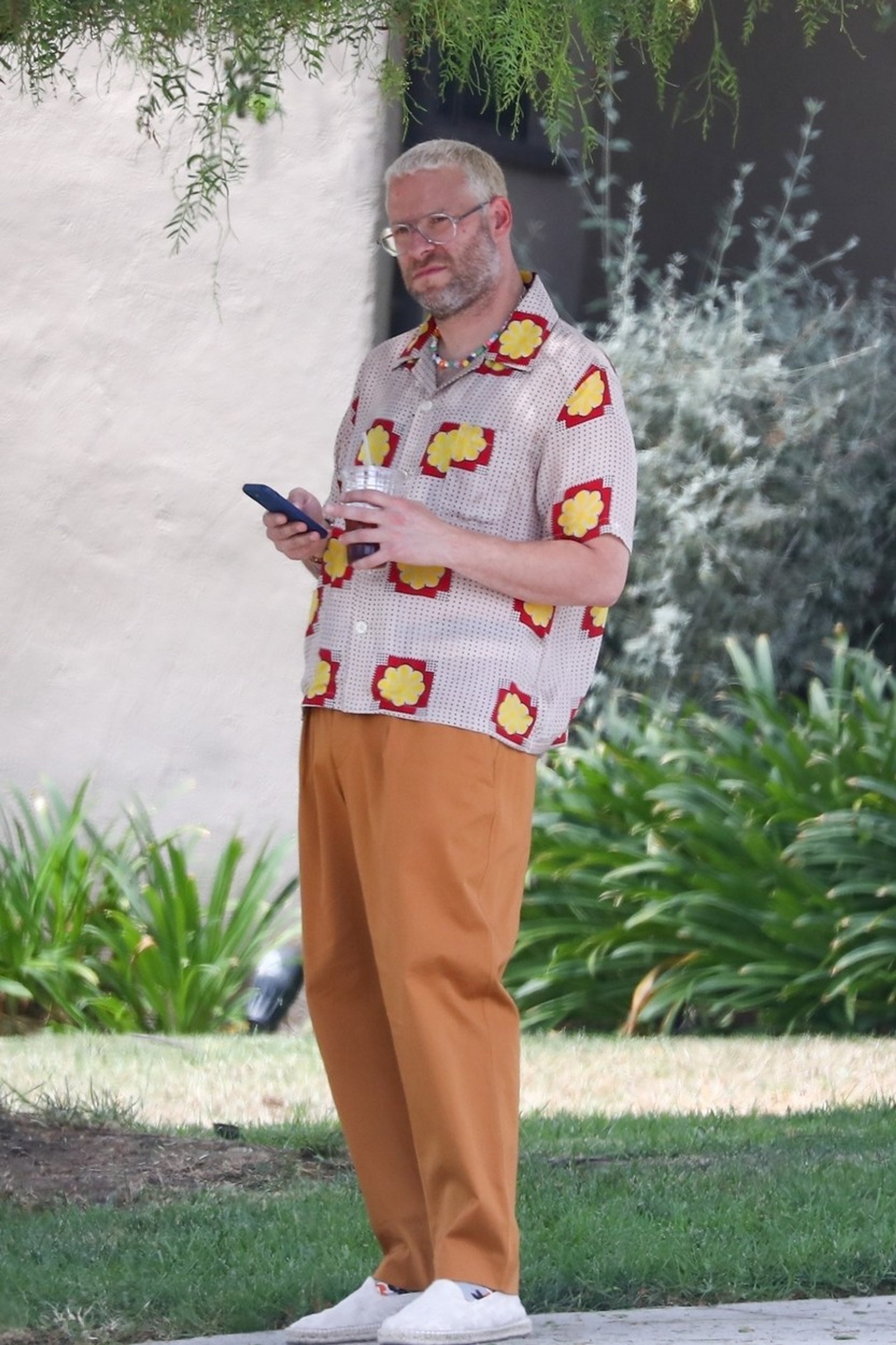 Наш любимый комик Сет Роген, оказывается, уже несколько месяцев ходит блондином, и новый цвет волос ему очевидно к лицу! Так же как и милый разноцветный чокер от Ian Charms и рубашка в цветочек от Bode.