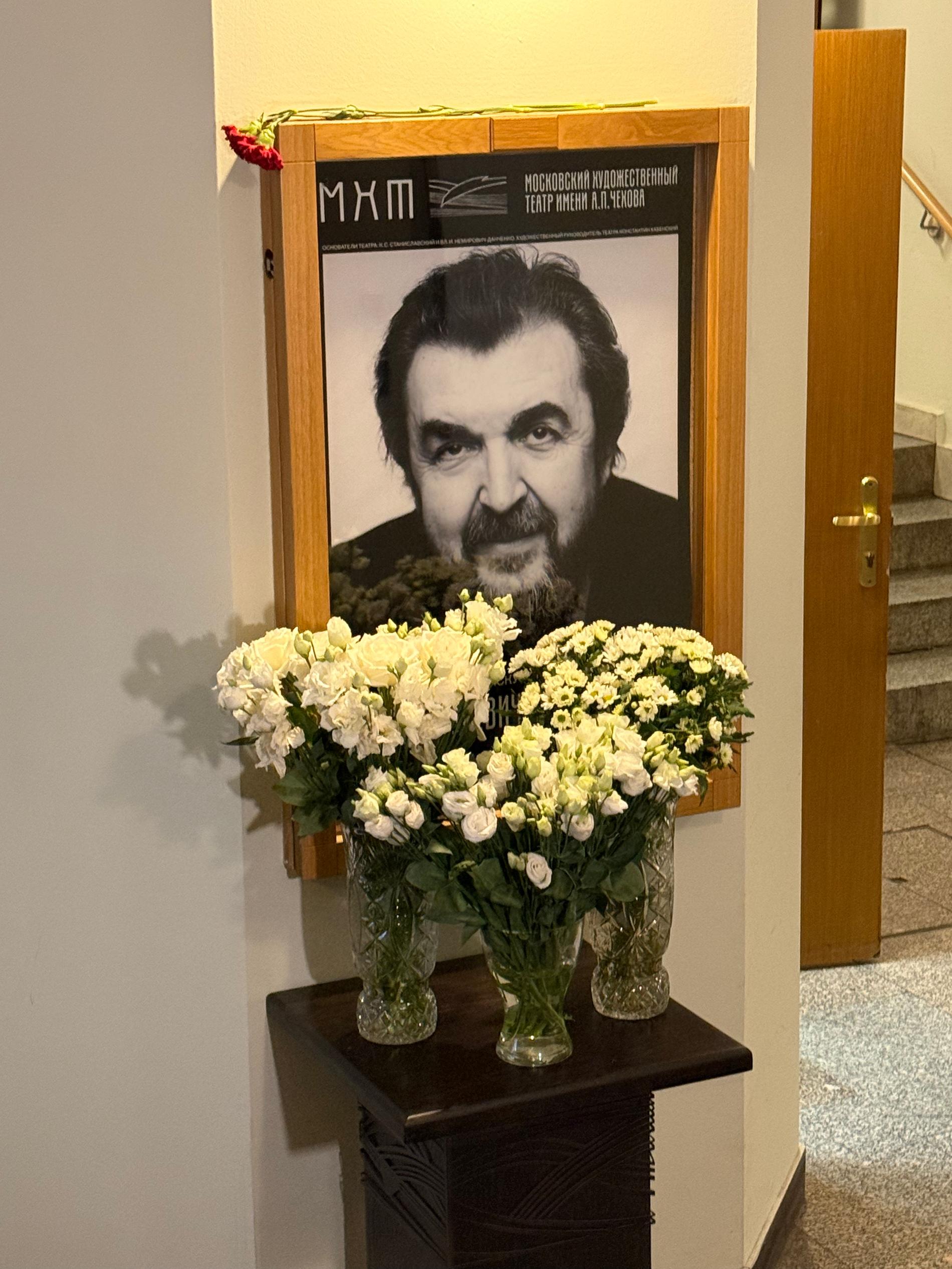 На входе в театр расположили чёрно-белое фото покойного ректора Школы-студии МХАТ, а также несколько букетов цветов.
