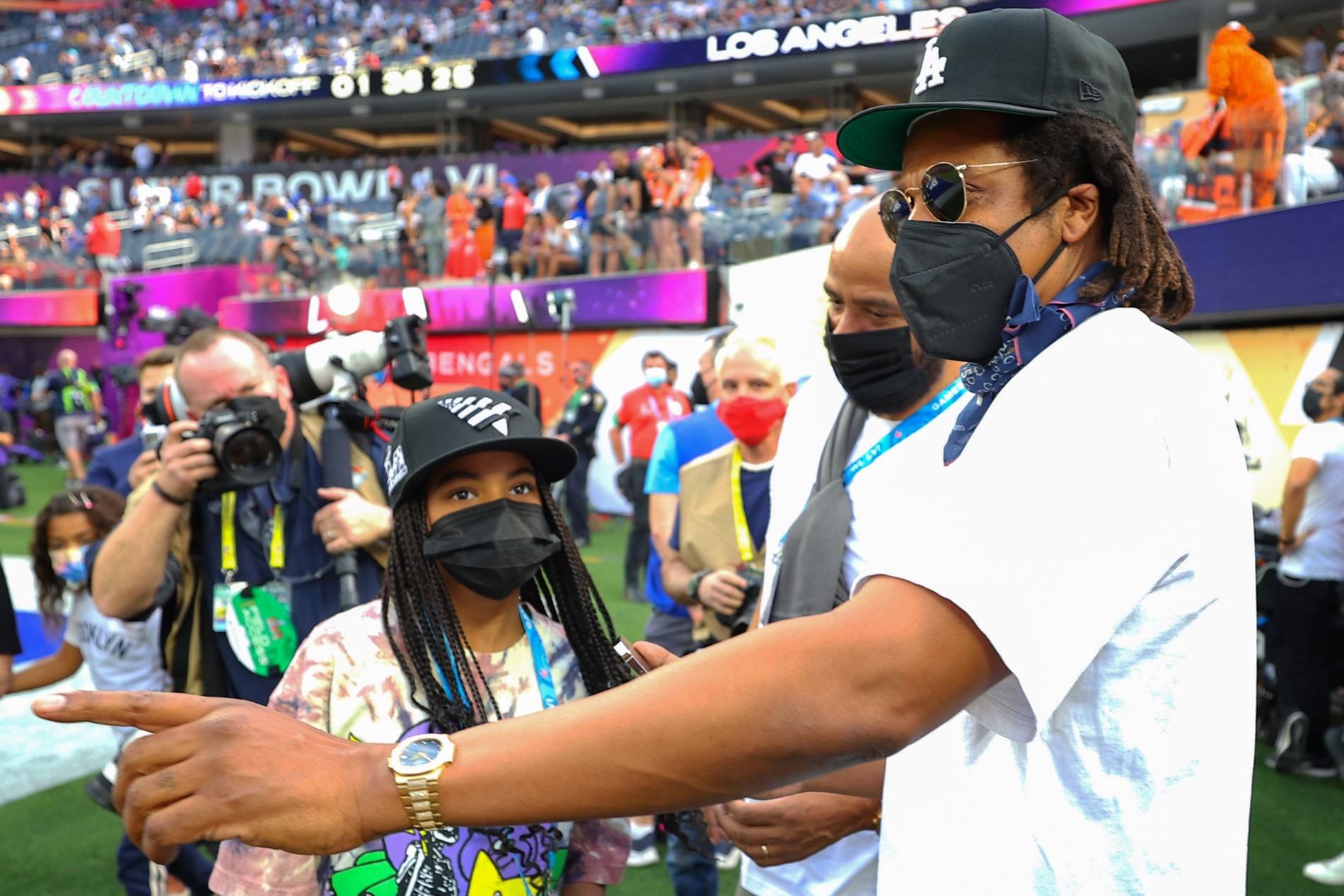 А вот Джей Зи, как примерный отец, пришел посмотреть игру со старшей дочерью — Блю Айви. Его супруга Бейонсе в этом году пропустила Супербоул.