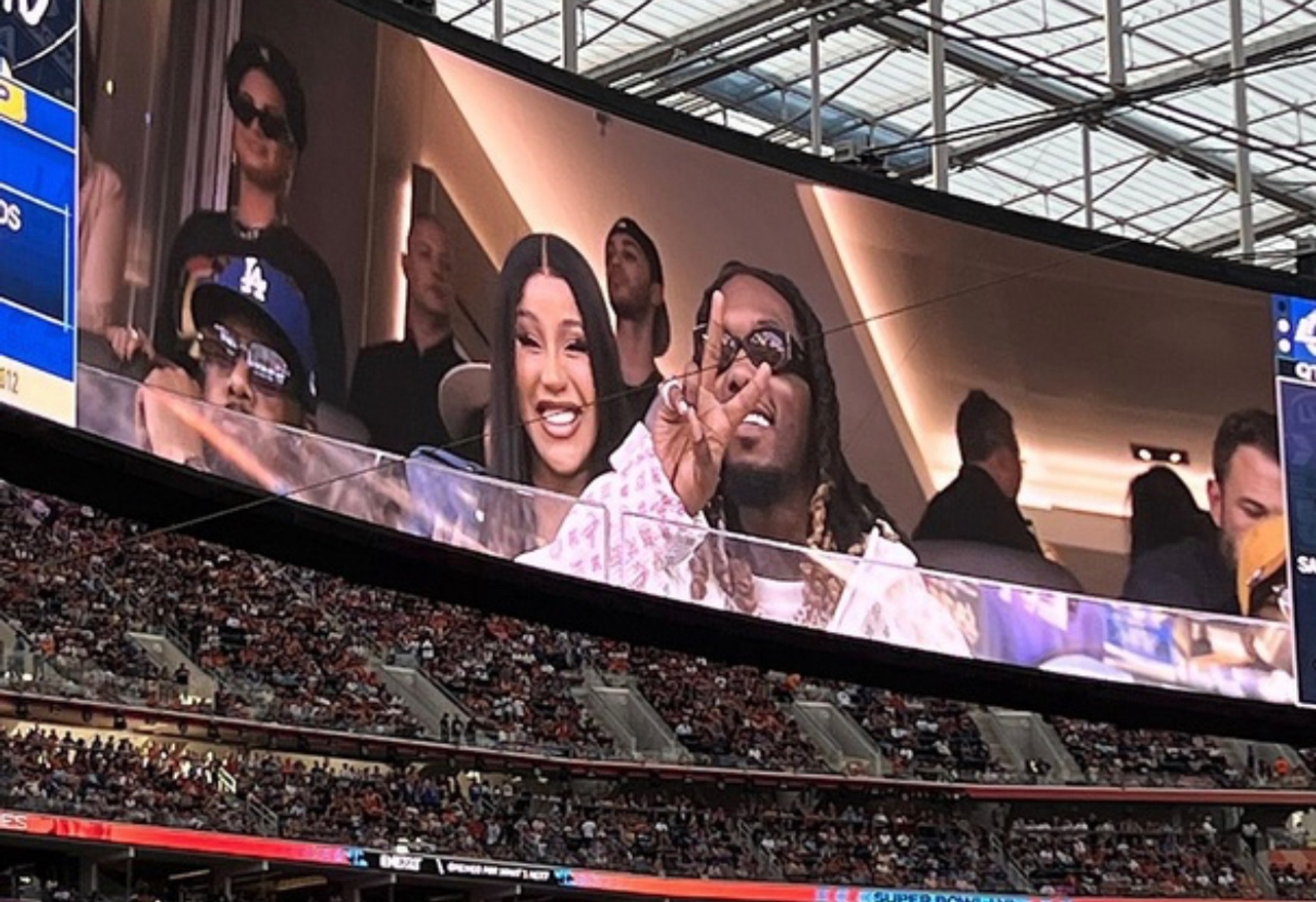 Дженнифер Лопес пришла на игру с возлюбленным — Беном Аффлеком. Джей танцевала и подпевала музыкантам, пока сидящая впереди Карди Би снимала шоу на телефон. Победившая недавно в суде рэперша появилась на Супербоуле с мужем Offset.