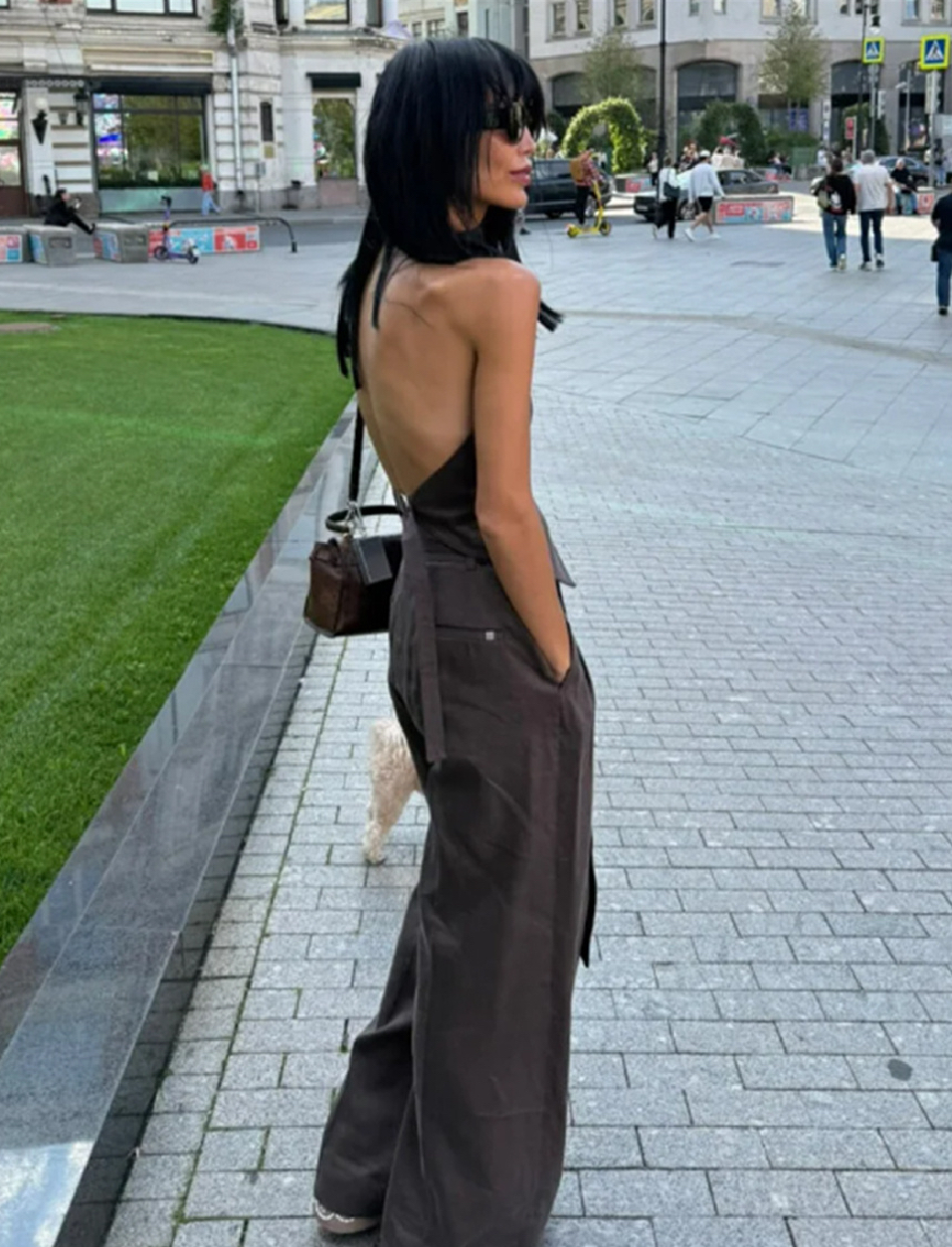 Стильный образ стал главным акцентом прогулки. Дарина выбрала элегантный летний наряд в модном оттенке «мокко-шоколад». Её образ состоял из топа с открытой спиной и свободных брюк, которые выгодно подчеркнули достоинства фигуры.