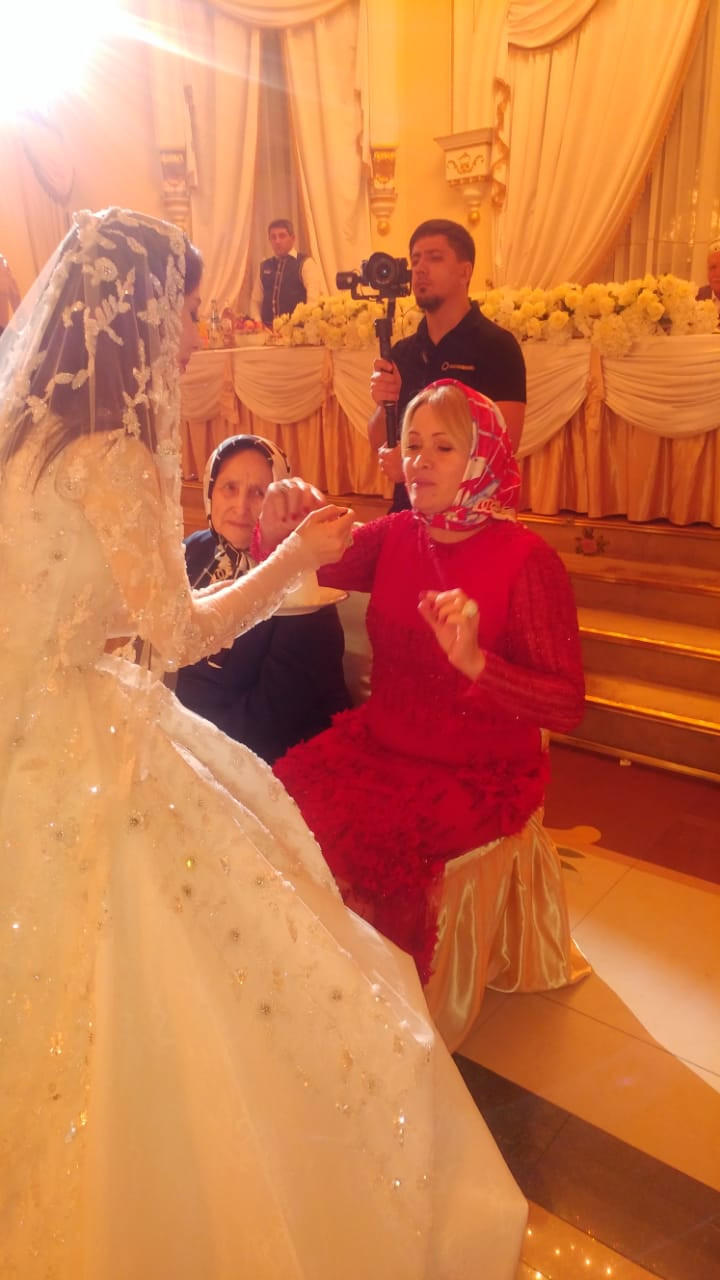 Однако сложных движений от нее и не требовалось. Мероприятие проходило по чеченской традиции, так что девушка почти всю свадьбу простояла под специальным шатром, куда подходили гости, чтобы поздравить и сделать памятное фото, пока 20-летний жених Ахмед был в отдельной комнате с друзьями и братьями.