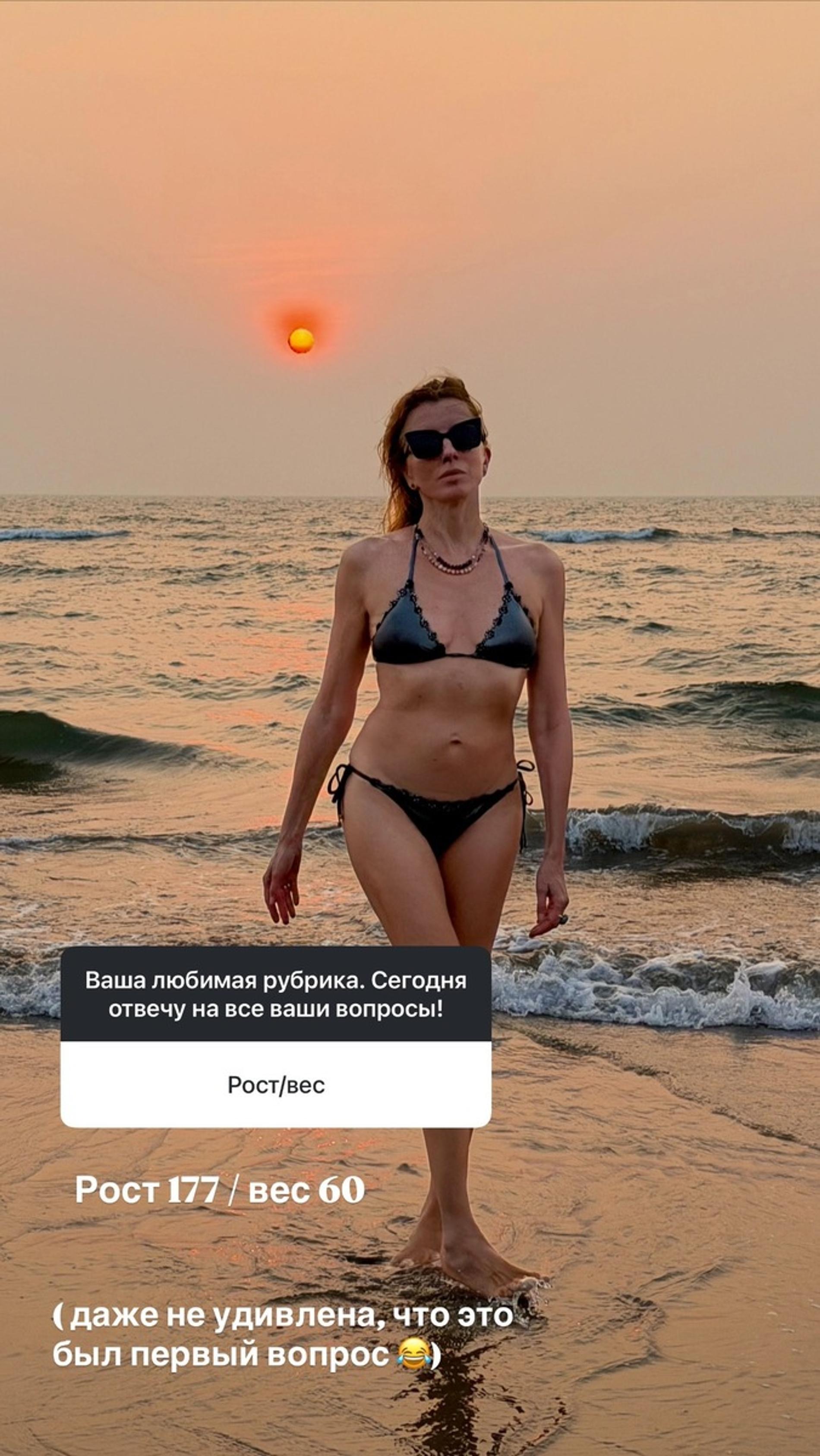 Светлана Бондарчук продемонстрировала фигуру в купальнике. В личном блоге в запрещённой соцсети светская львица отвечала на вопросы поклонников, и, разумеется, первым оказался вопрос о её внешнем виде. Так, подписчики поинтересовались, какой у неё вес и рост. Бондарчук честно ответила: она весит 60 килограммов при росте 170 сантиметров.