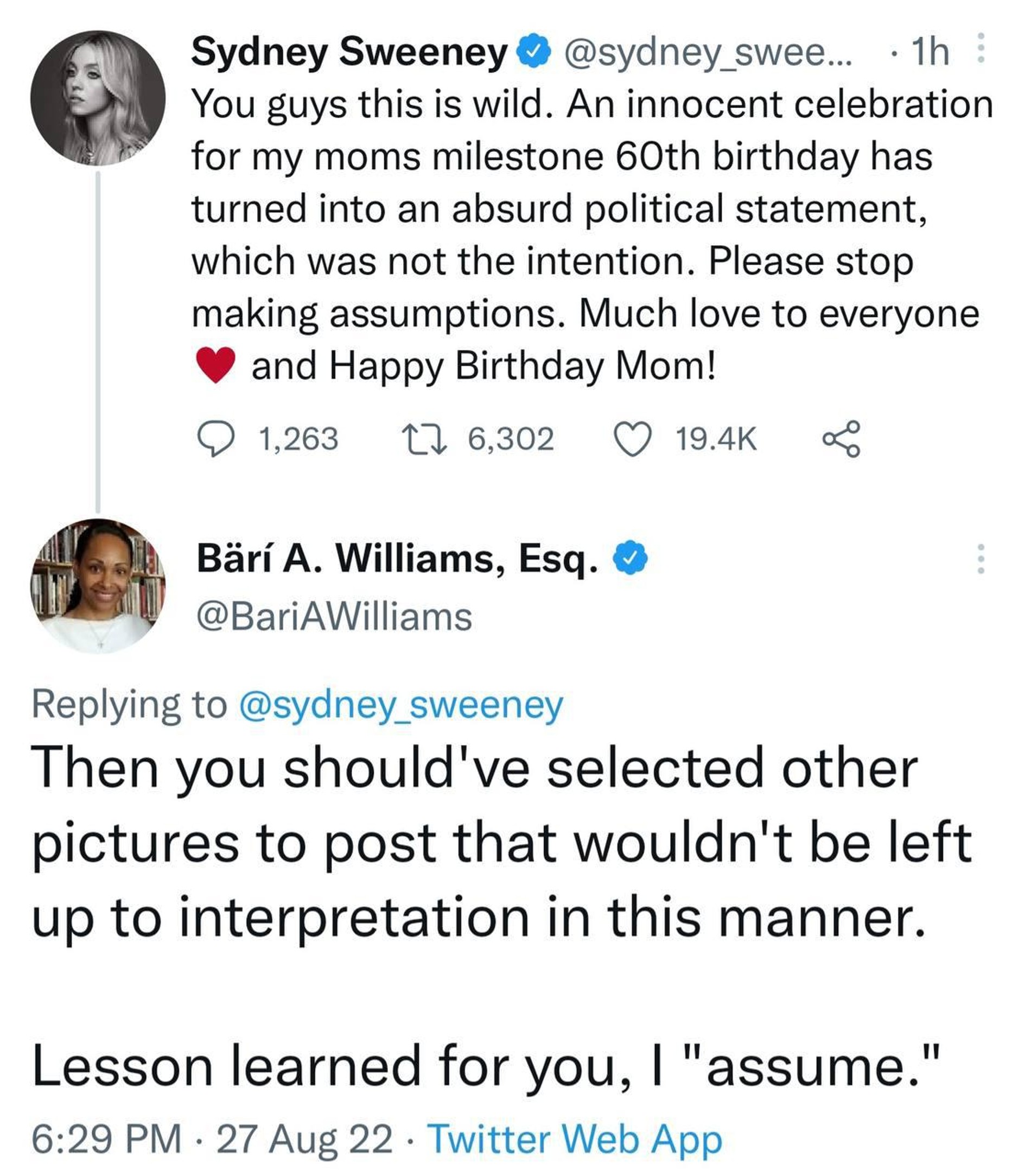 Началась эта история, казалось бы, совсем невинно: вчера актриса Сидни Суини, которую мы знаем по роли Кэсси в «Эйфории», выложила серию фотографий со дня рождения своей мамы. Тут-то веселый праздник в техасском стиле и закончился кэнселлингом. Подписчики начали негодовать, когда увидели на гостях те самые MAGA-кепки, которые действуют на зетеров-борцов «за все хорошее» примерно как красная тряпка на быка. И немедленно бросились строчить гневные комментарии, несмотря на то что на бейсболках был написан вовсе не слоган предвыборной кампании Трампа, а его шуточная версия Make Sixty Great Again — «Сделай 60 лет снова великими». Больше масла в огонь подлила фотография, на которой Сидни, ее мама и бабушка режут свадебный торт в компании мужчины в футболке с логотипом Blue Lives Matter. Это движение в защиту американских полицейских было основано как ответ на протесты Black Lives Matter. Теперь Сидни обвиняют в том, что она поддерживает республиканцев — едва ли не самый страшный грех в традиционно либеральном Голливуде.