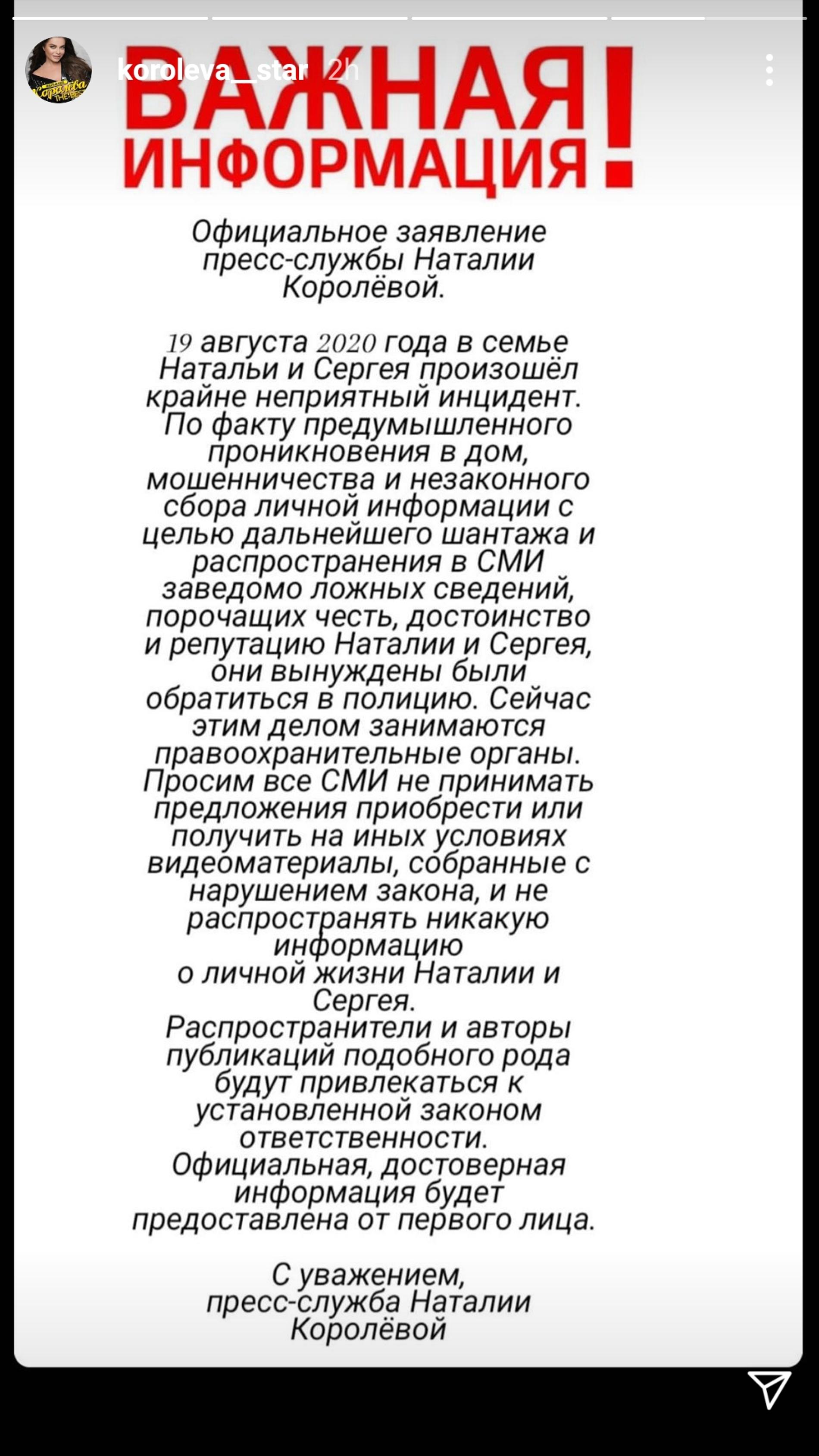Как сообщается, кражу нажитого непосильным трудом Королева заметила, вернувшись из отпуска. Пока супруга отдыхала, Тарзан проводил время с двумя девушками в их доме. Сама обвиняемая, как сообщает телеграм-канал Mash, вину уже признала и пояснила, что пошла на кражу драгоценностей «из ревности» и уже наняла адвоката. Интересно, что заявление в полицию супруги понесли вместе, стало быть, пока о разводе речи не идет. Теперь же сама Наташа, пусть и через пресс-службу, прокомментировала случившееся, опубликовав обращение в своем Инстаграме.