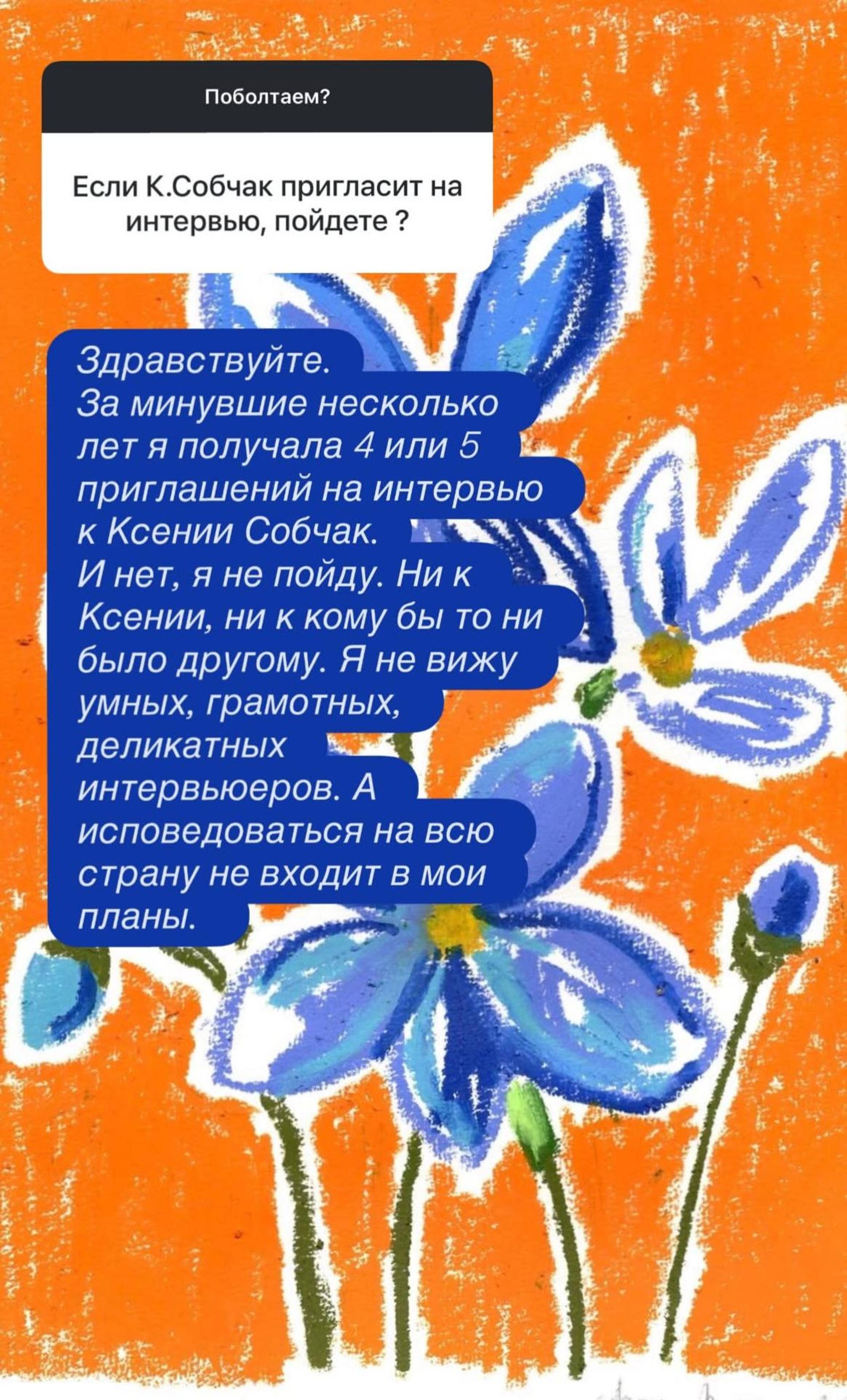Блогер также рассказала о неоднократных приглашениях от Ксении Собчак — за последние несколько лет Брухунова получала их четыре или пять раз, но неизменно отвечала отказом.