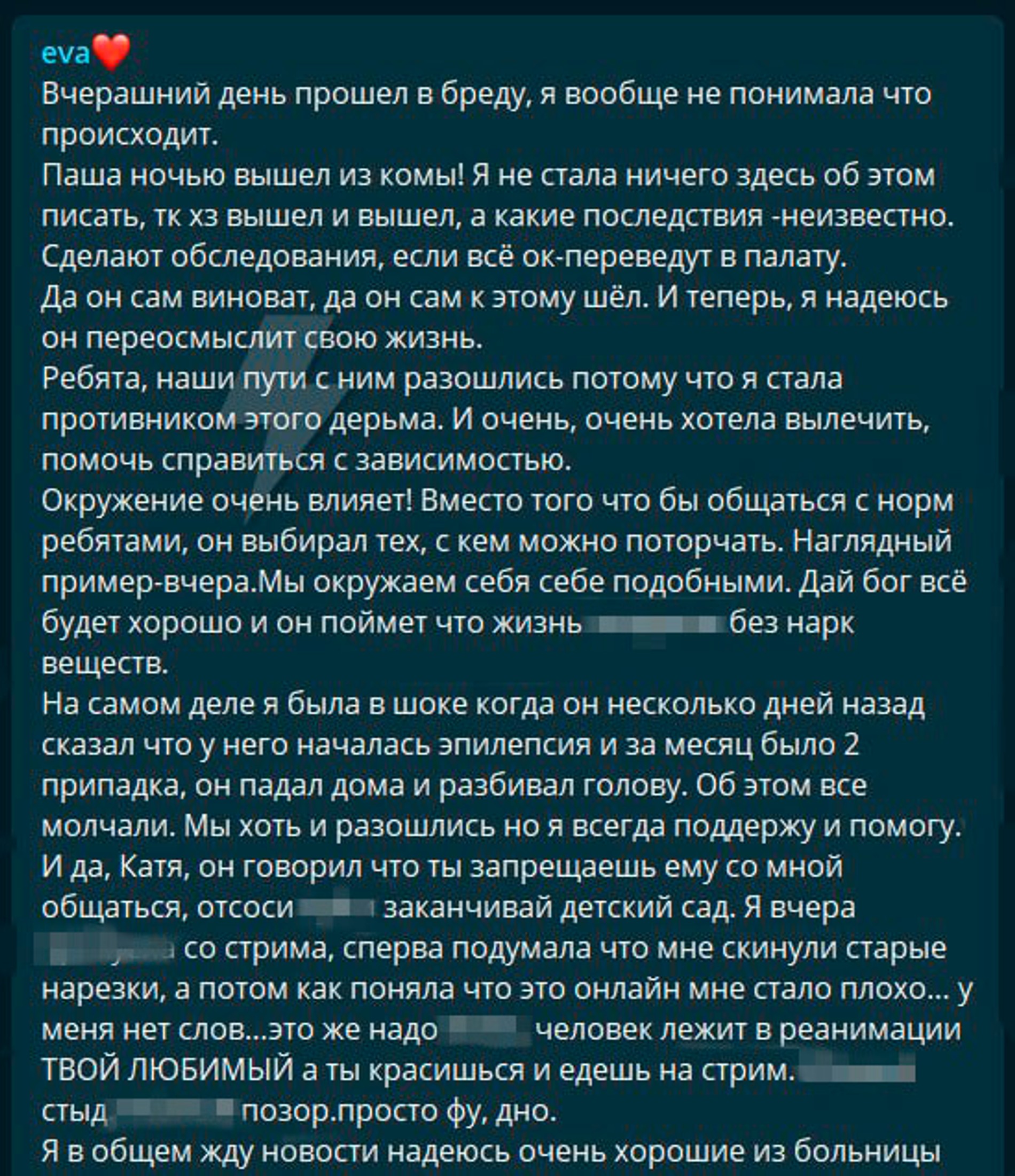 Вчера рэпера Пашу Техника в судорогах увезли в Боткинскую больницу. По некоторым данным, скандальный хип-хоп-артист принял в студии транквилизаторы, которые ему прописал психотерапевт, а позднее неудачно оттянулся с запрещенными веществами на вечеринке. Микс оказался губительным, и Паша впал в кому в больнице. Весь вечер девушка рэпера Катя Лоли держала фанатов в курсе его (но скорее своего) состояния, раздавая подписчикам обещания, что больше не будет изменять Паше. И вот сегодня ночью она наконец принесла хорошие вести и рассказала, что Техник вышел из комы. Тем временем его бывшая жена Ева Карицкая пообещала, что подаст в суд на всех, кто имел отношение к инциденту. И заодно задала Кате резонный вопрос: почему, пока ее любимый лежал в реанимации, она первым делом отправилась на стрим.