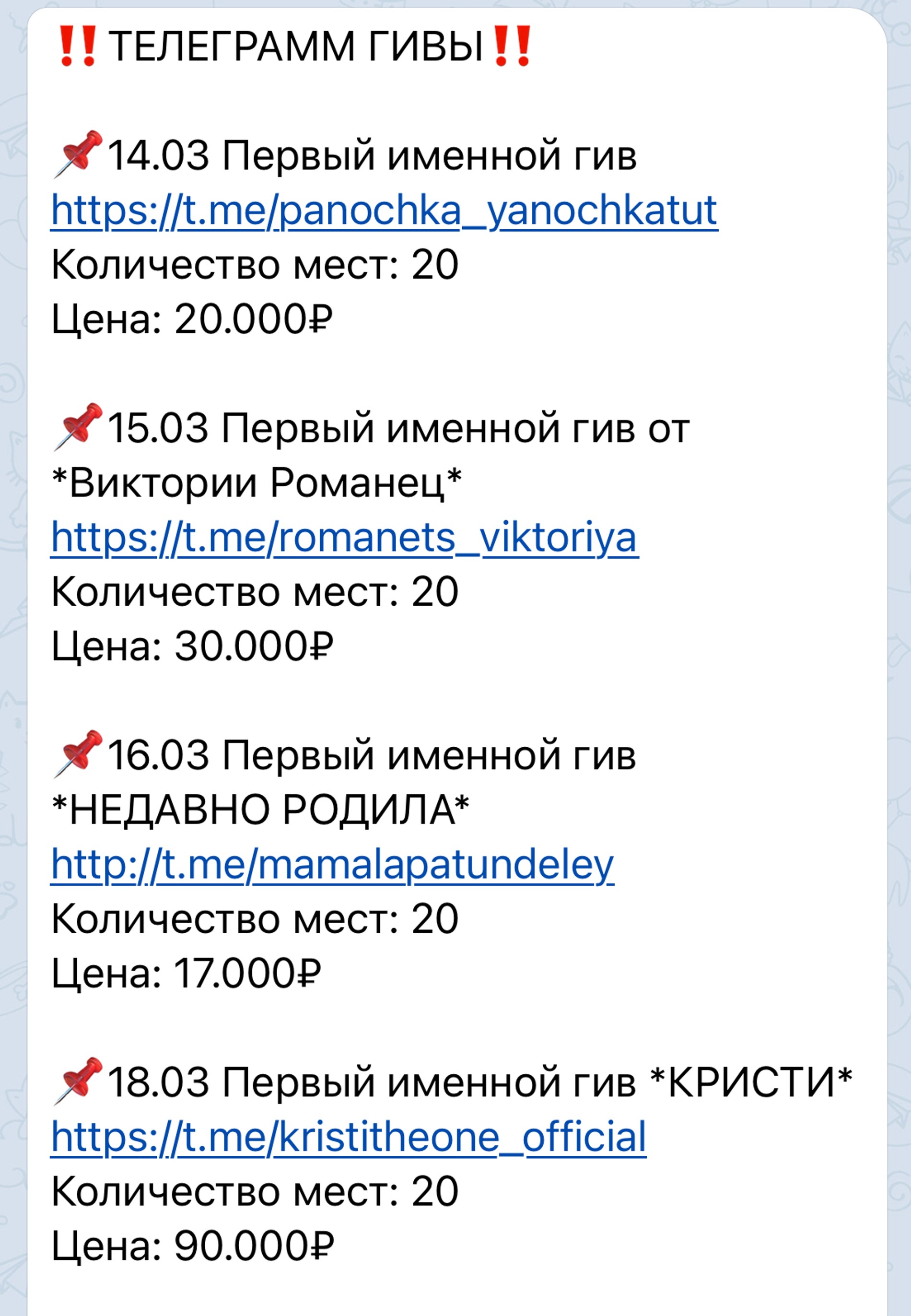 Средняя цена за спонсорство в гиве — 30 тысяч рублей (во времена рассвета в Инстаграме цена была в 10 раз больше). К примеру, столько стоит именной гив звезды «Дома-2» Виктории Романец, а акция от блогерши Kristi The One — 90 тысяч. Инфлюенсер Алина Акимова разыгрывает раздачу на три дня за 75 тысяч, а инста-мамочка Кристина Черкасова — за 25 500.