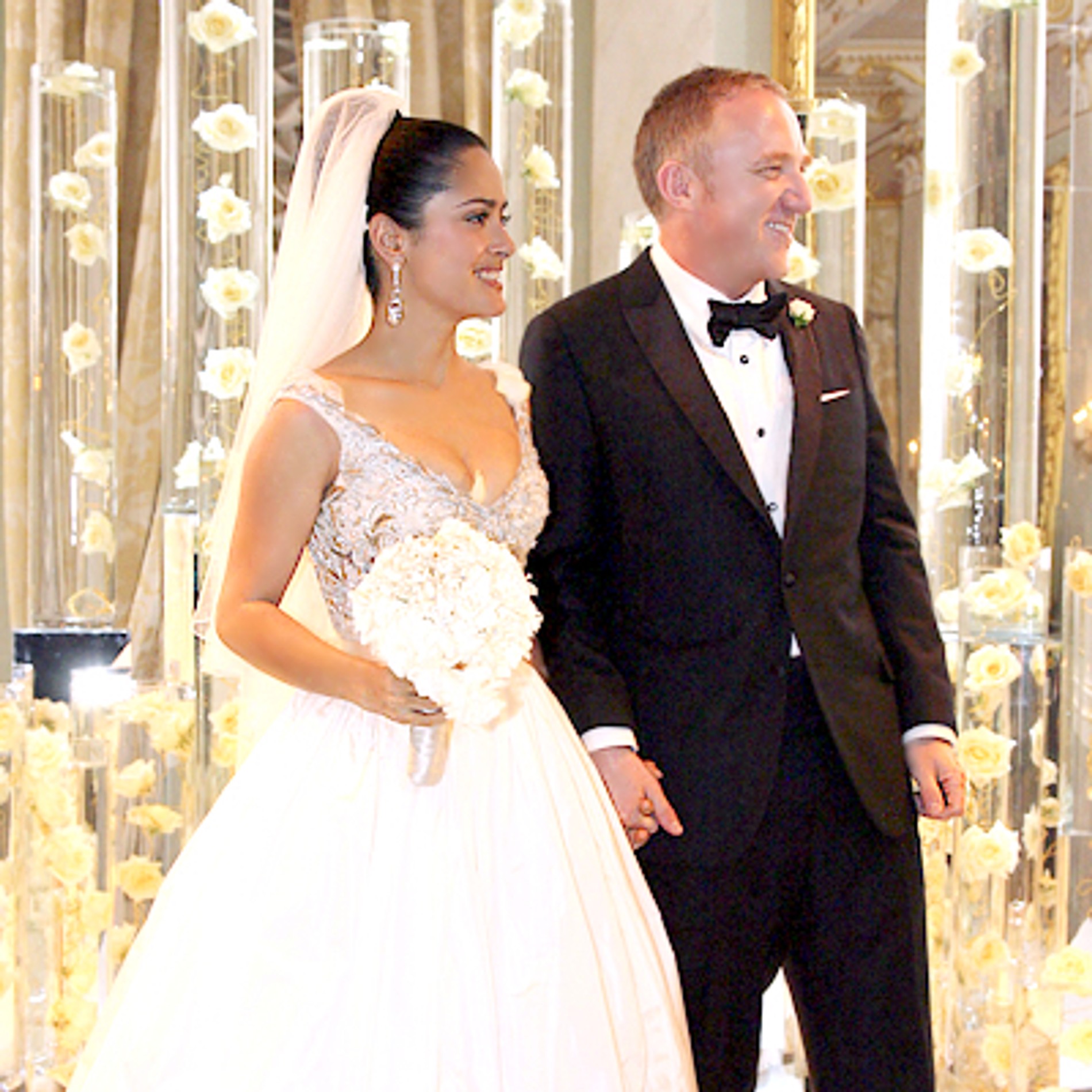 До конца рассмотреть подвенечный наряд Сальмы Хайек нельзя даже спустя тринадцать лет после церемонии, настолько редко актриса делится личными фотографиями памятного дня. На кадрах можно разглядеть только верх с открытым декольте, фату и сатиновый пышный низ. Все целиком — идея Николя Жескьера, который в 2009 году работал в Balenciaga.