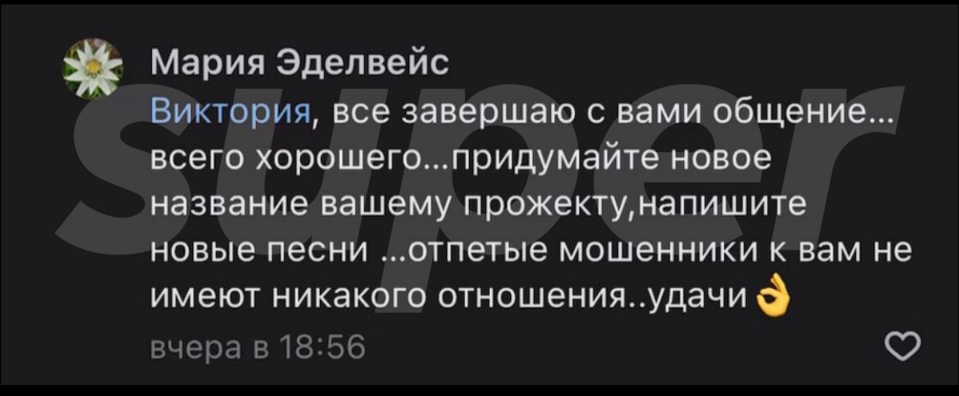 «Слава переживал, что нет работы. Я сделала все, что могла, как директор. Его как отработанный элемент выбросили. Я считаю, что это только деньги, только жадность. Чтобы оставлять себе максимальное количество денег. У нас была съемка 9-го числа, последнее интервью мы отсняли, мы расстались, он на меня посмотрел, я ему сказала: «Слава, ты даже мысли не допускай, мы тебя не бросим». Он переживал, что мы его бросим»