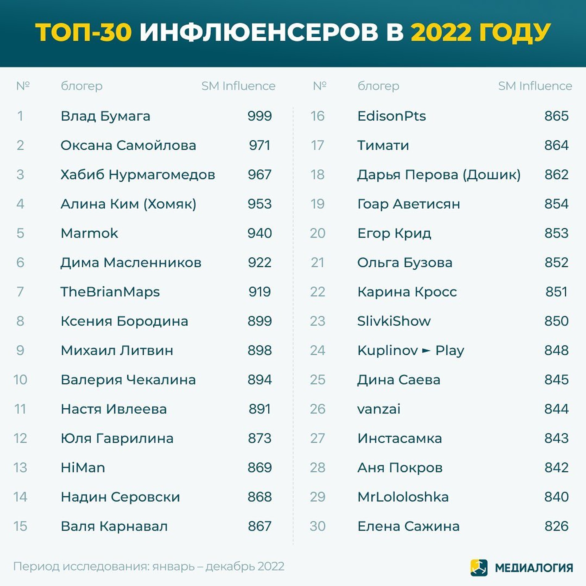 Кто вошел в топ-30 самых влиятельных блогеров в 2022 году