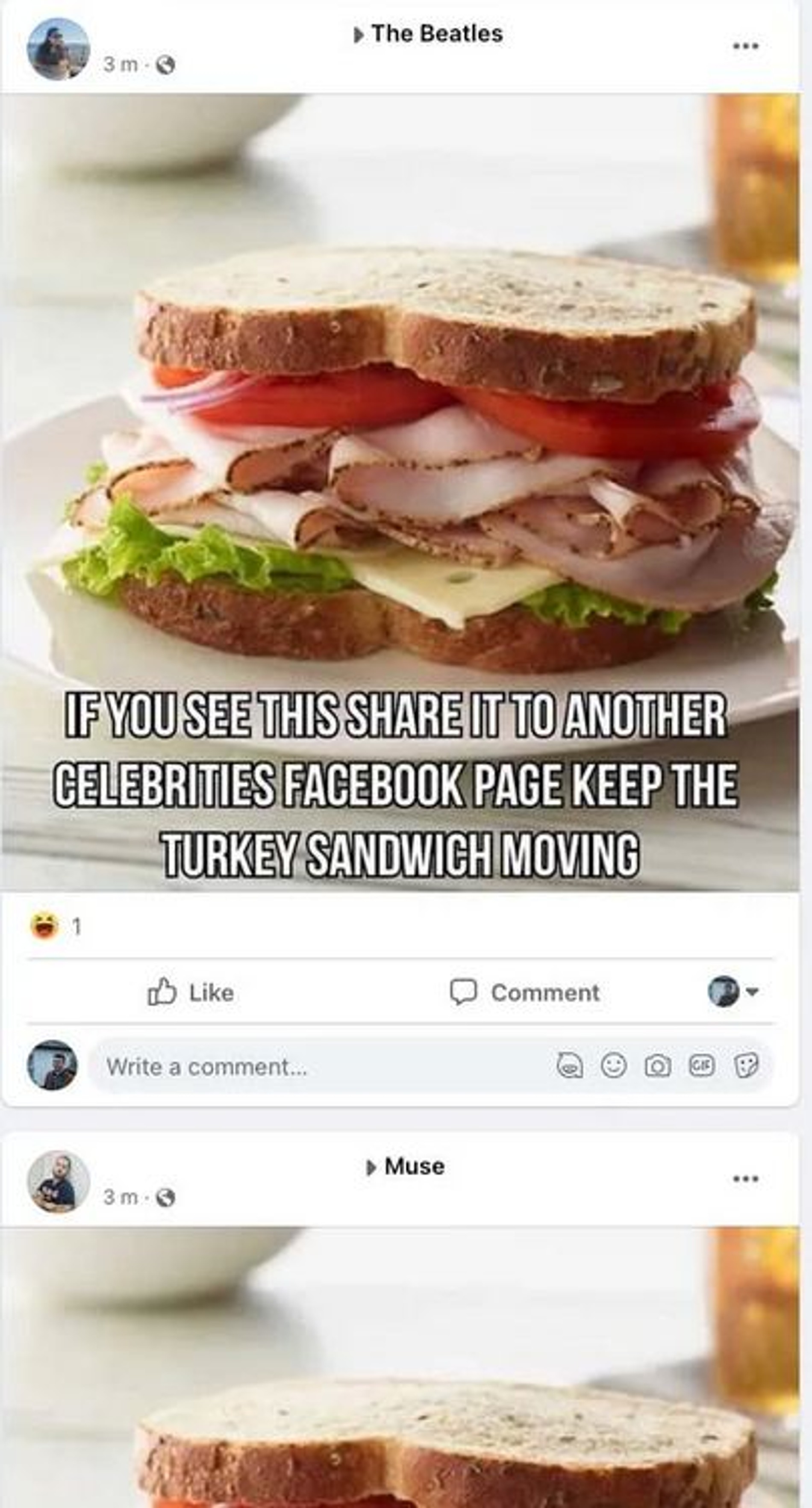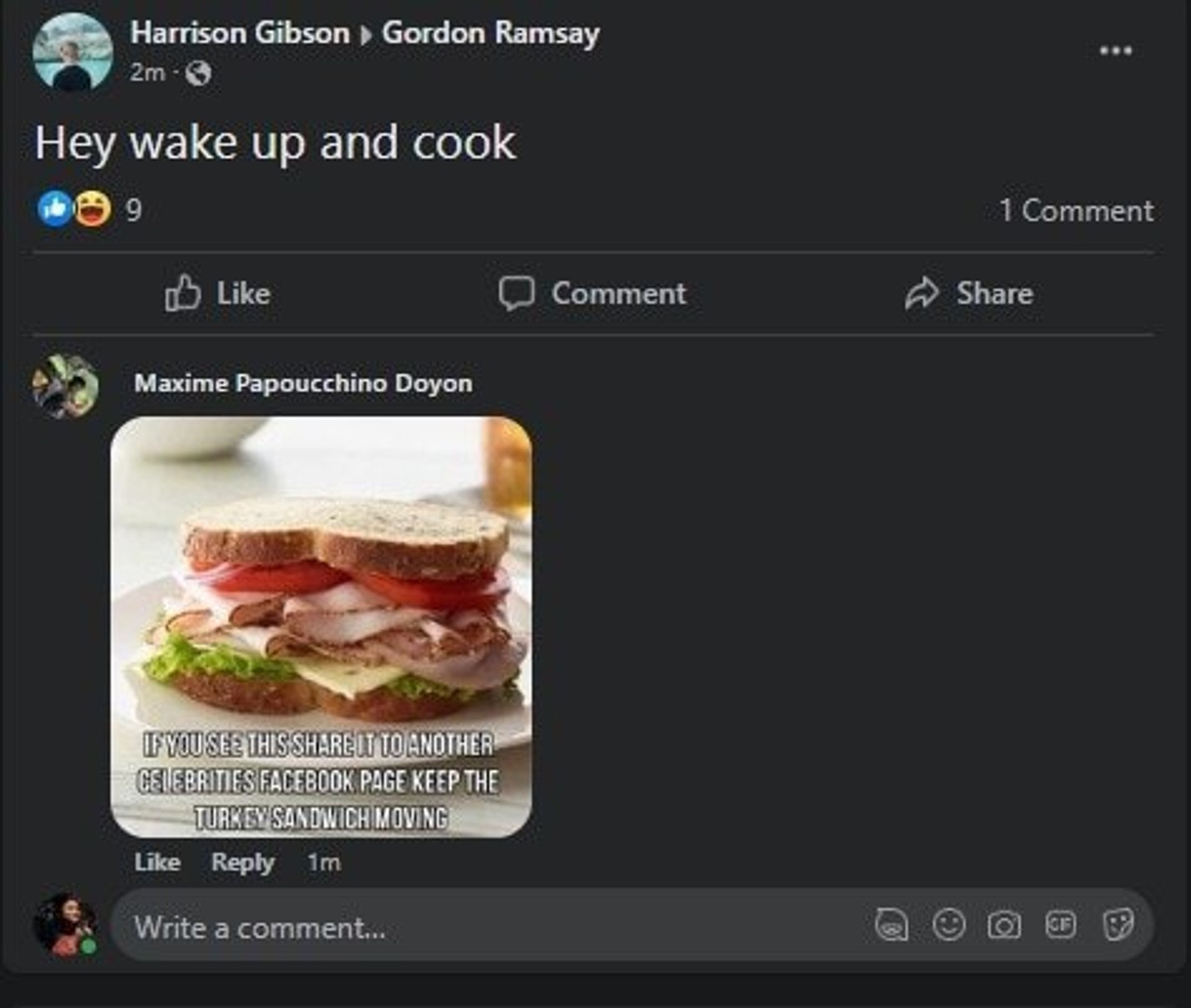Одной из самых популярных записей, которую многие могли углядеть в своей ленте, стал мем сэндвича с индейкой, подписанный так: «Если вы это читаете, поделитесь картинкой на странице другой знаменитости в Фейсбук*, чтобы сэндвич с индейкой гулял дальше». Мем долетел и до всемирно известного шеф-повара Гордона Рамзи. Один из пользователей написал ему: «Хей, проснись и готовь нам!»