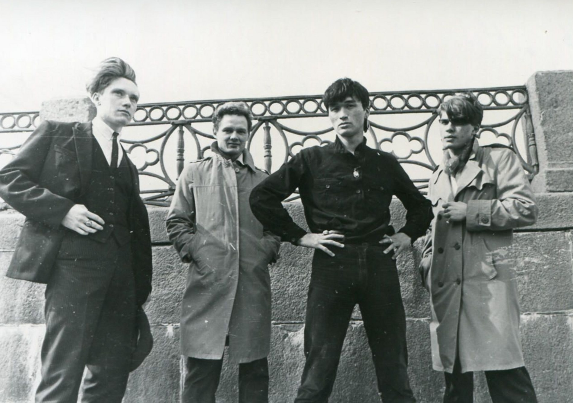 Одно из относительно ранних фото «Кино» в Ленинграде. Ребята, кажется, вовсю подражают образам заморских постпанк-групп: плащи, черные рубашки и джентльменские стрижки.