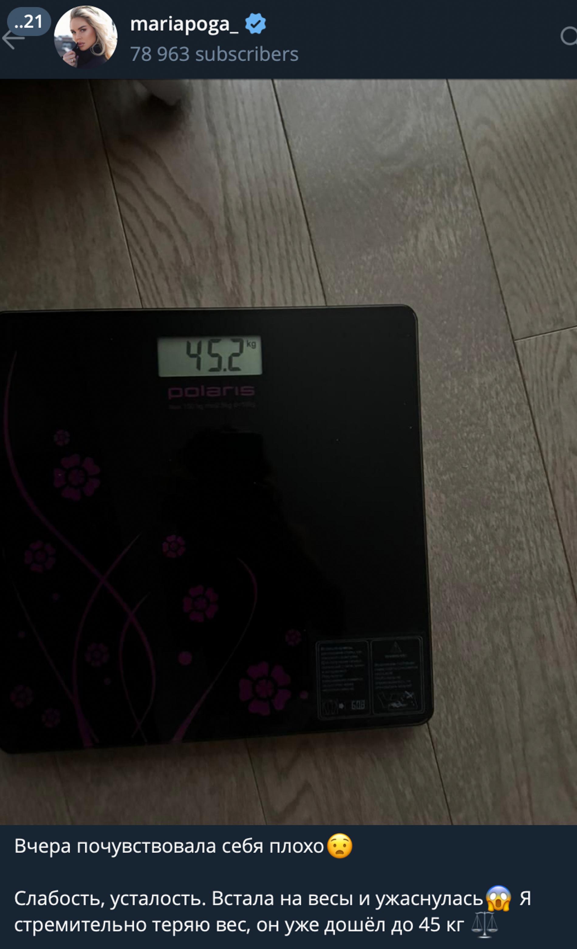 Кто-то перед новогодними торжествами худеет, чтобы втиснуться в изящные наряды и вступить в следующий год, так сказать, налегке, а вот у Марии Погребняк задача, похоже, прямо противоположная. Модель стремительно теряет вес. На этом фоне у нее ухудшилось состояние здоровья: Мария жалуется на слабость и усталость. Встав сегодня на весы, многодетная мама решила, что все дело в слишком уж стремительном похудении. Увиденные цифры Марию ужаснули.