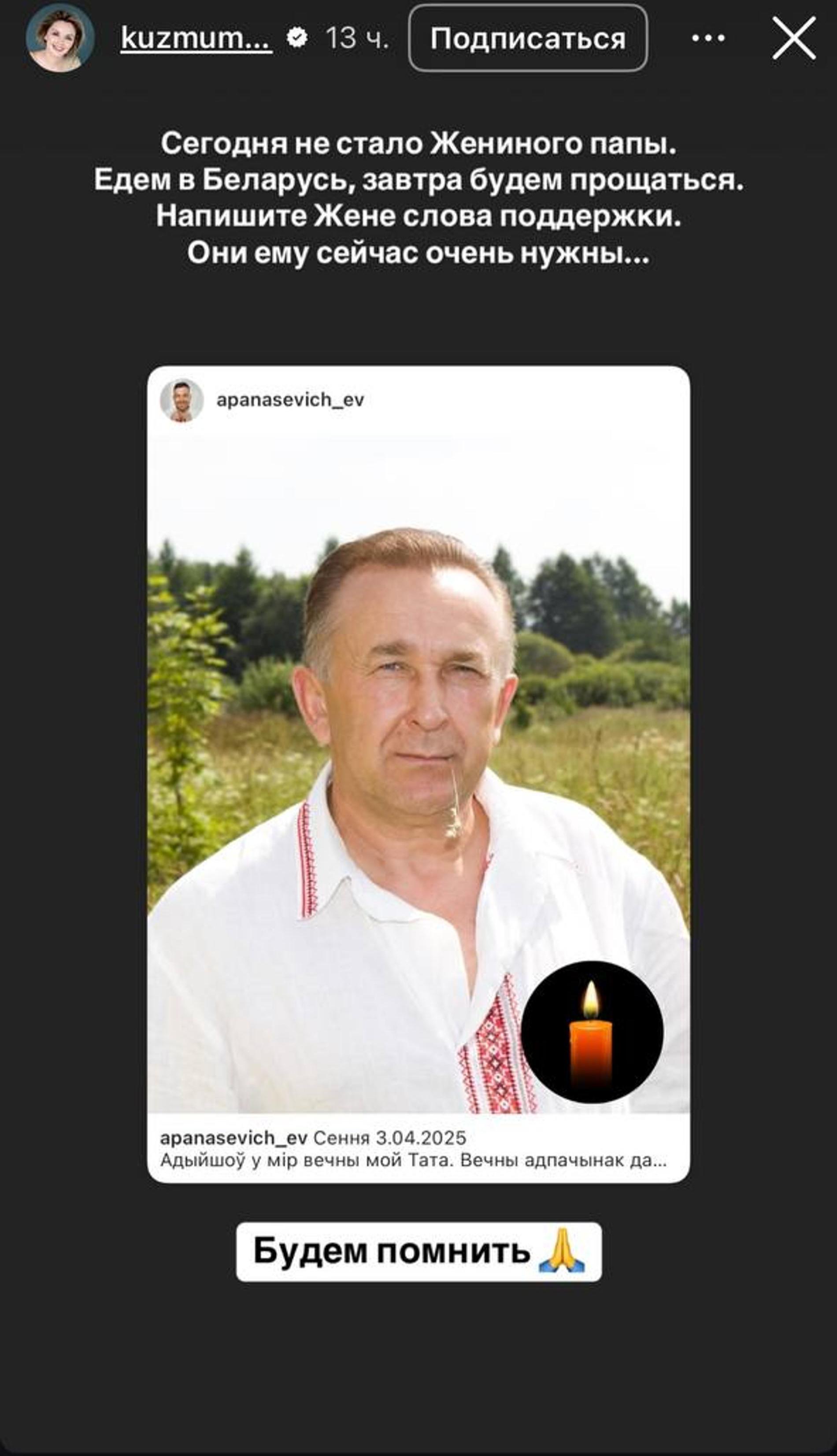 Звезда сериала «Кухня» Ольга Кузьмина сообщила о горе в её семье — ушёл из жизни отец мужа актрисы. «Сегодня не стало Жениного папы. Едем в Беларусь, завтра будем прощаться», — написала актриса в сторис в запрещённой соцсети, репостнув душераздирающую публикацию супруга. В посте сам Евгений Апанасевич трогательно обратился к отцу: «Мой папа отошёл в мир иной. Даруй ему вечный покой, Боже. Ты всегда с нами», — написал он.