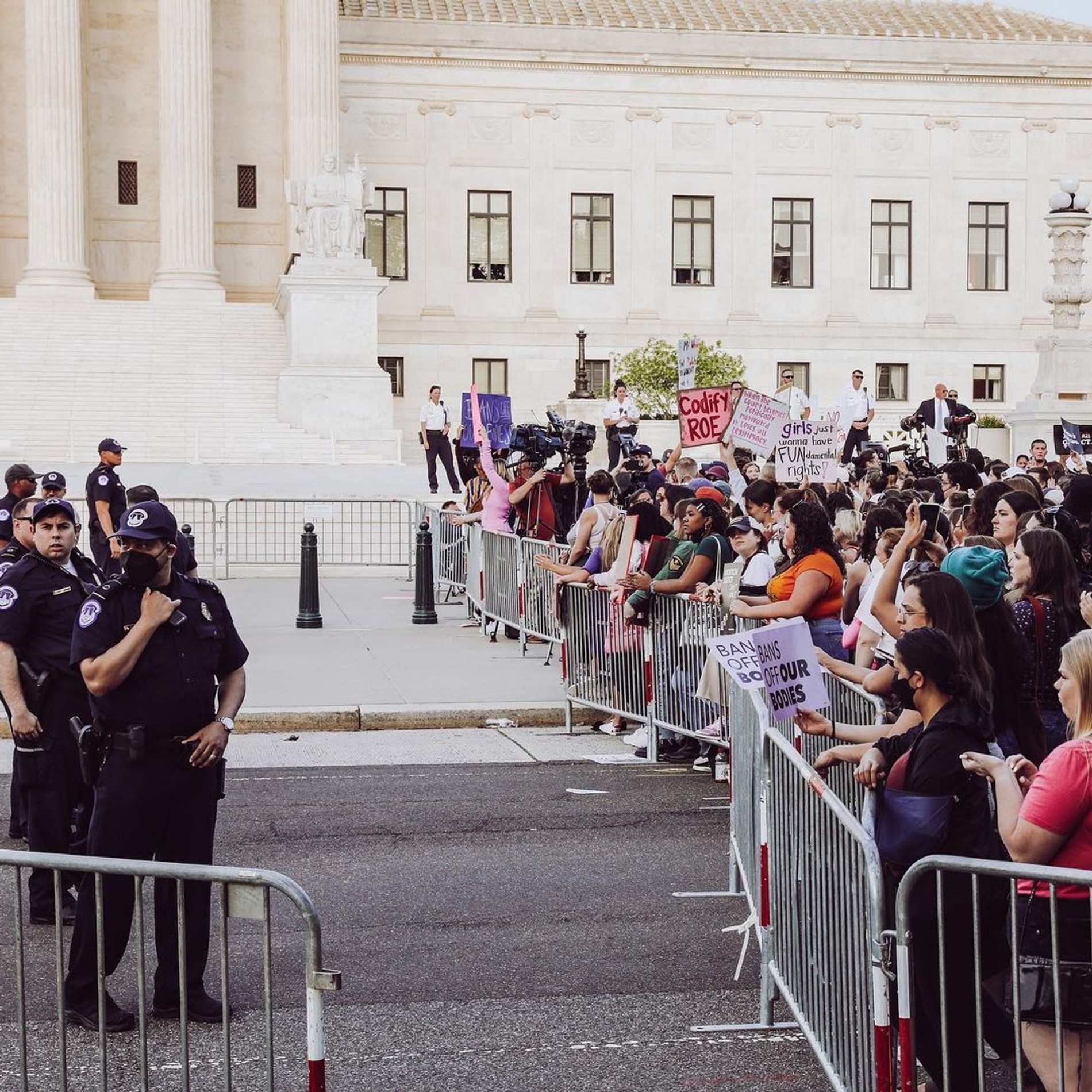 Возле здания Верховного суда в Вашингтоне, а также на площади в Нью-Йорке американцы собрались на стихийный митинг. Около микрофона лозунги выкрикивали Синтия Никсон и Эми Шумер, фотографию возле суда с маленьким сыном Сильвестром также опубликовала Эмили Ратаковски.