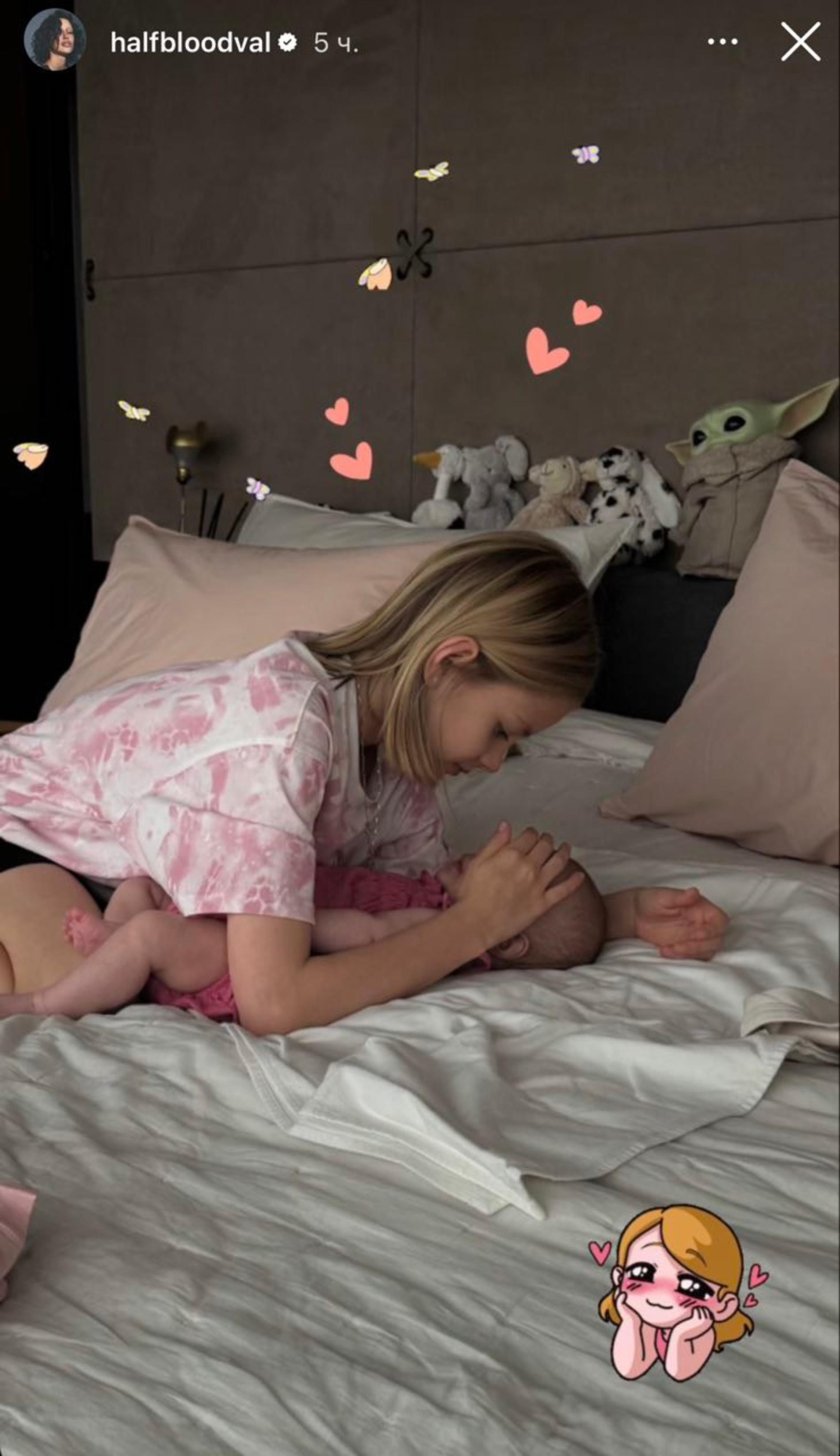Сёстры устроились на кровати, Алиса склонилась над Эммой и нежно гладила её по голове. Обе девочки одеты в розовое: старшая — в лёгкую футболку с размытым принтом, а маленькая Эмма — в милый боди. Валентина Иванова сопроводила снимок стикерами сердечек.