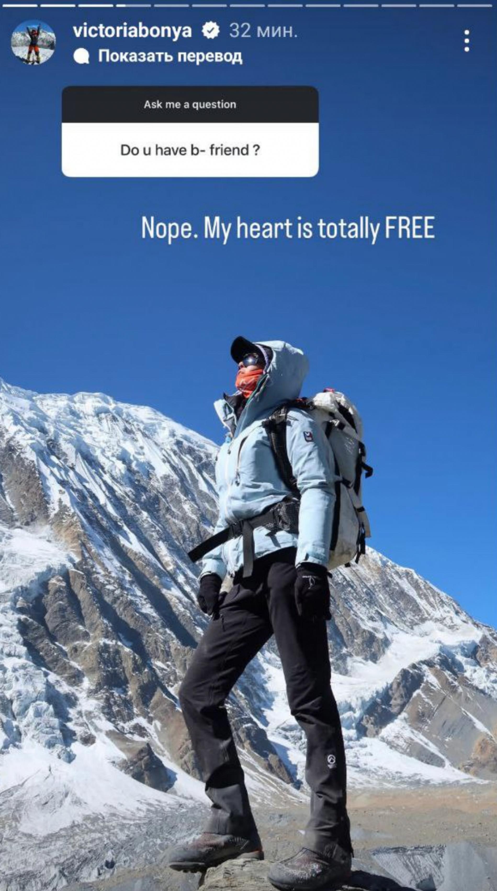 Накануне в запрещенной соцсети Виктория Боня поговорила о личном публично. В том числе телеведущая ответила на вопрос, есть ли у нее в данный момент возлюбленный. Как оказалось, сейчас звезда свободна как ветер и потому, видимо, со спокойной совестью надолго пропадает в горах. «Мое сердце абсолютно свободно», — честно призналась Вика в сторис, написав последнее слово капслоком.