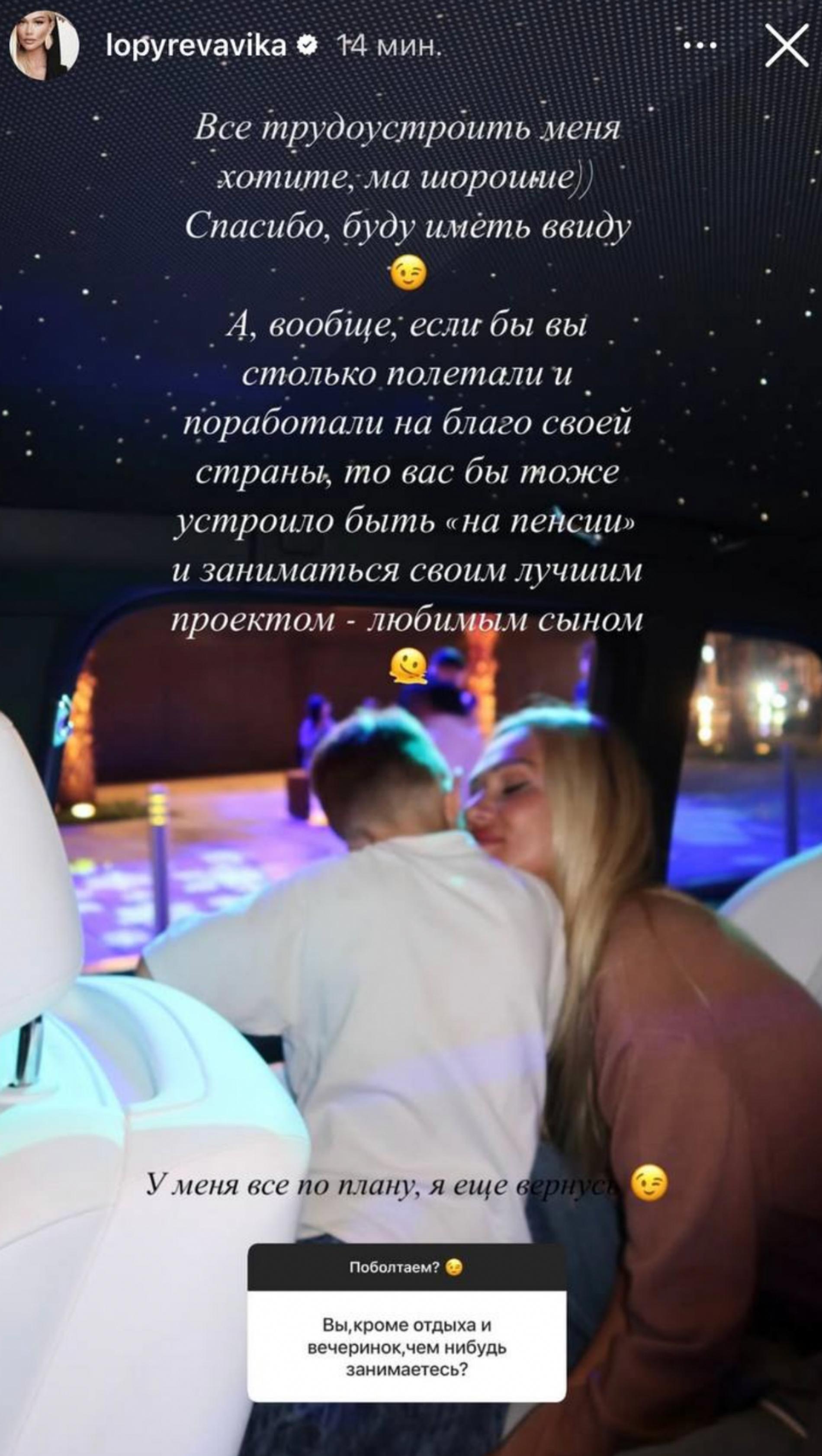 Девушка ответила в том же духе и заодно призналась, что в «статусе» пенсионерки. «Все трудоустроить меня хотите, мои хорошие. Спасибо, буду иметь в виду. А вообще, если бы вы столько полетали и поработали на благо своей страны, то вас бы тоже устроило быть "на пенсии" и заниматься своим лучшим проектом — любимым сыном», — сказала Лопырева.