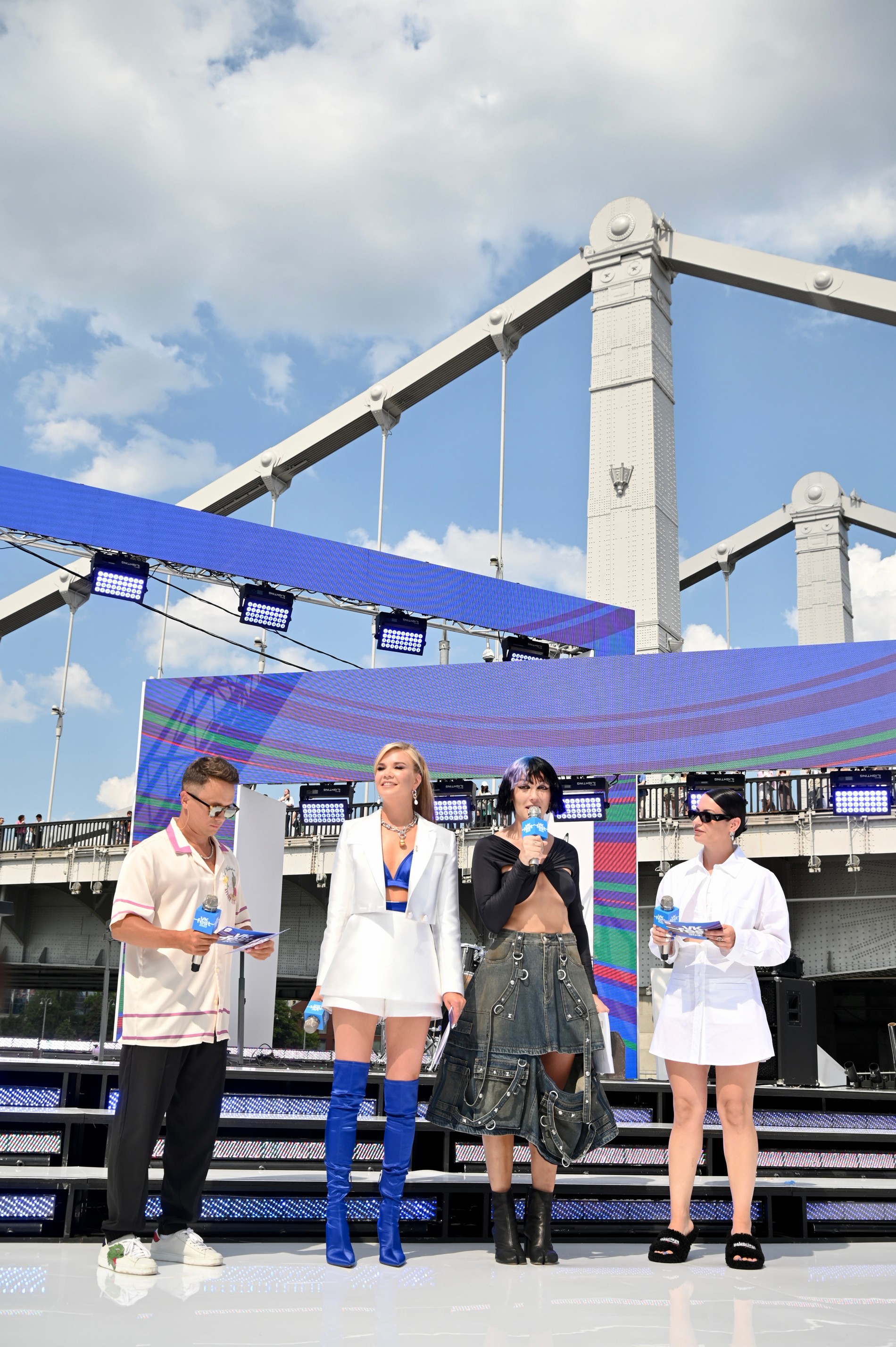 Отдельный респект за образ достается Алле Михеевой, которая стала ведущей фестиваля вместе с Настей Ивлеевой, Идой Галич и Ильей Соболевым. Роскошные сапоги выше колен в пантон дорожки, синий купальник, белый мини-костюм с атласным жакетом и объемная цепь — стилисты постарались на славу. Ида Галич тоже сделала ставку на белый и представляла артистов в образе примерной студентки, который на контрасте дополнила шлепанцами Balenciaga.