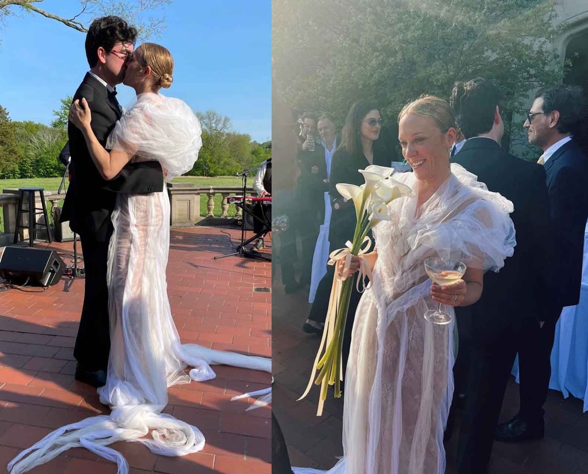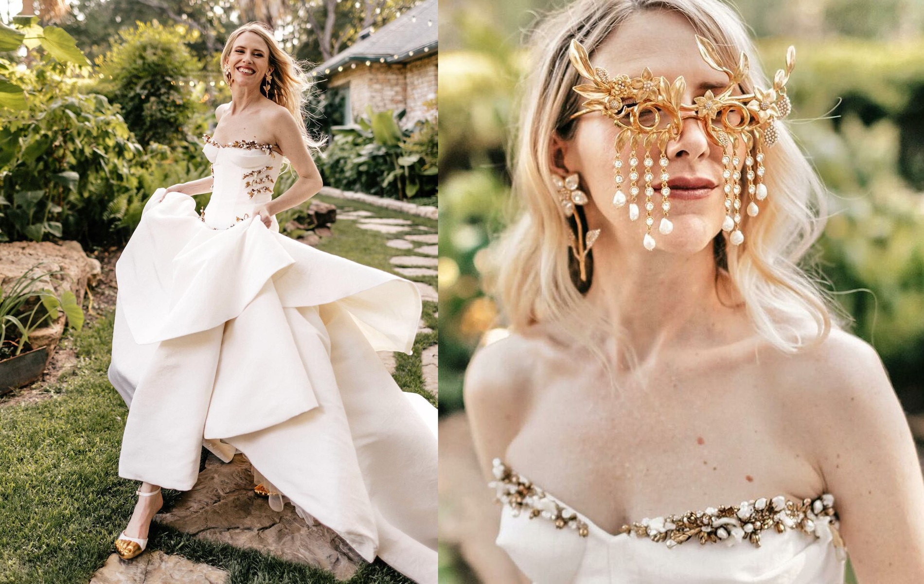 Ну и наконец, главной героиней самой трогательной забрендированной свадьбы стала девушка, чье имя вы точно услышите впервые. Лиз Фокс Розберри, младшая сестра Дэниела Розберри, креативного директора Schiaparelli, вышла замуж в Техасе в придуманном им платье-трансформере, золотых туфлях «с пальцами» и огромными очками с жемчужными слезами, а ее избранник удостоился сюрреалистического украшения для галстука. И пиар-эффект от ее праздничного ролика был не меньше, чем от появления Леди Гаги в платье Schiaparelli на инаугурации Байдена или дефиле Беллы Хадид в Каннах в ожерелье-ветке.