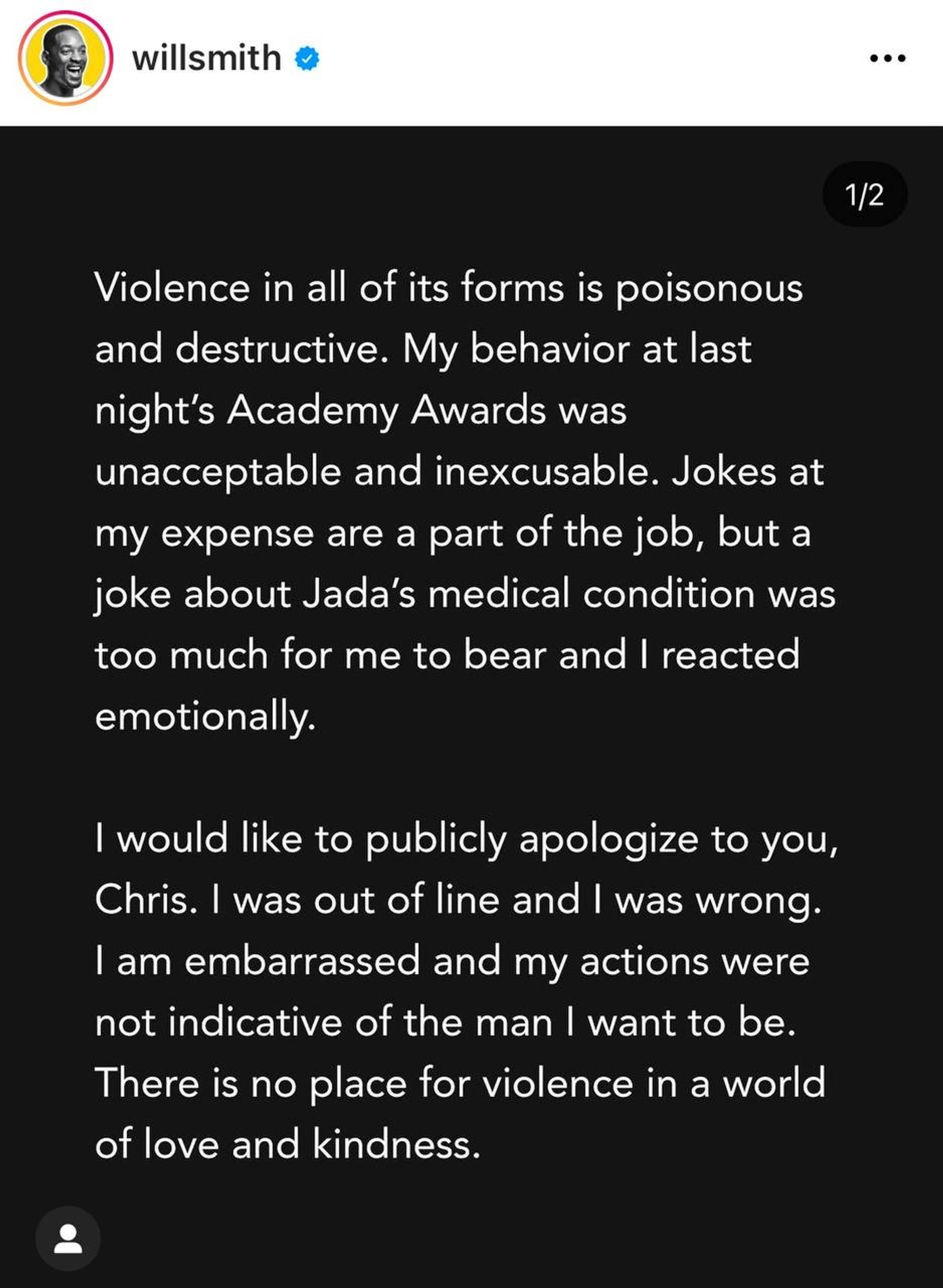«Шутки на мой счет — это часть работы, но шутка о состоянии здоровья Джады была для меня невыносимой, и я отреагировал эмоционально. Я хочу публично перед тобой извиниться, Крис, я переступил черту и был не прав. Мне очень стыдно, и мои действия не были присущи человеку, которым я бы хотел быть. В мире любви и доброты нет места насилию »
